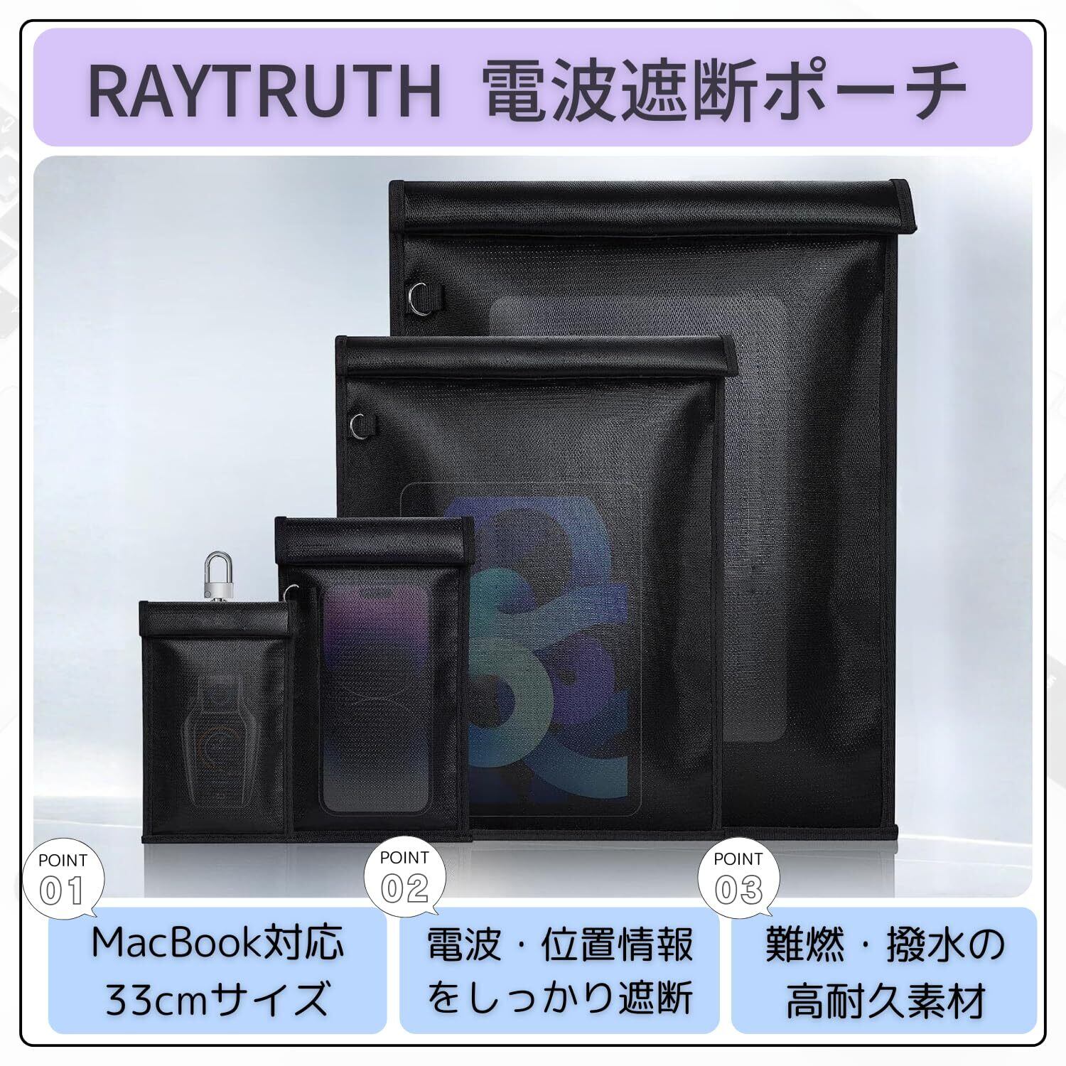 【人気商品】RAYTRUTH 電波遮断ポーチ スキミング防止 防炎防水 GPS カット 13インチMacBook対応 タブレットバッグ 電磁波防止 (XL)