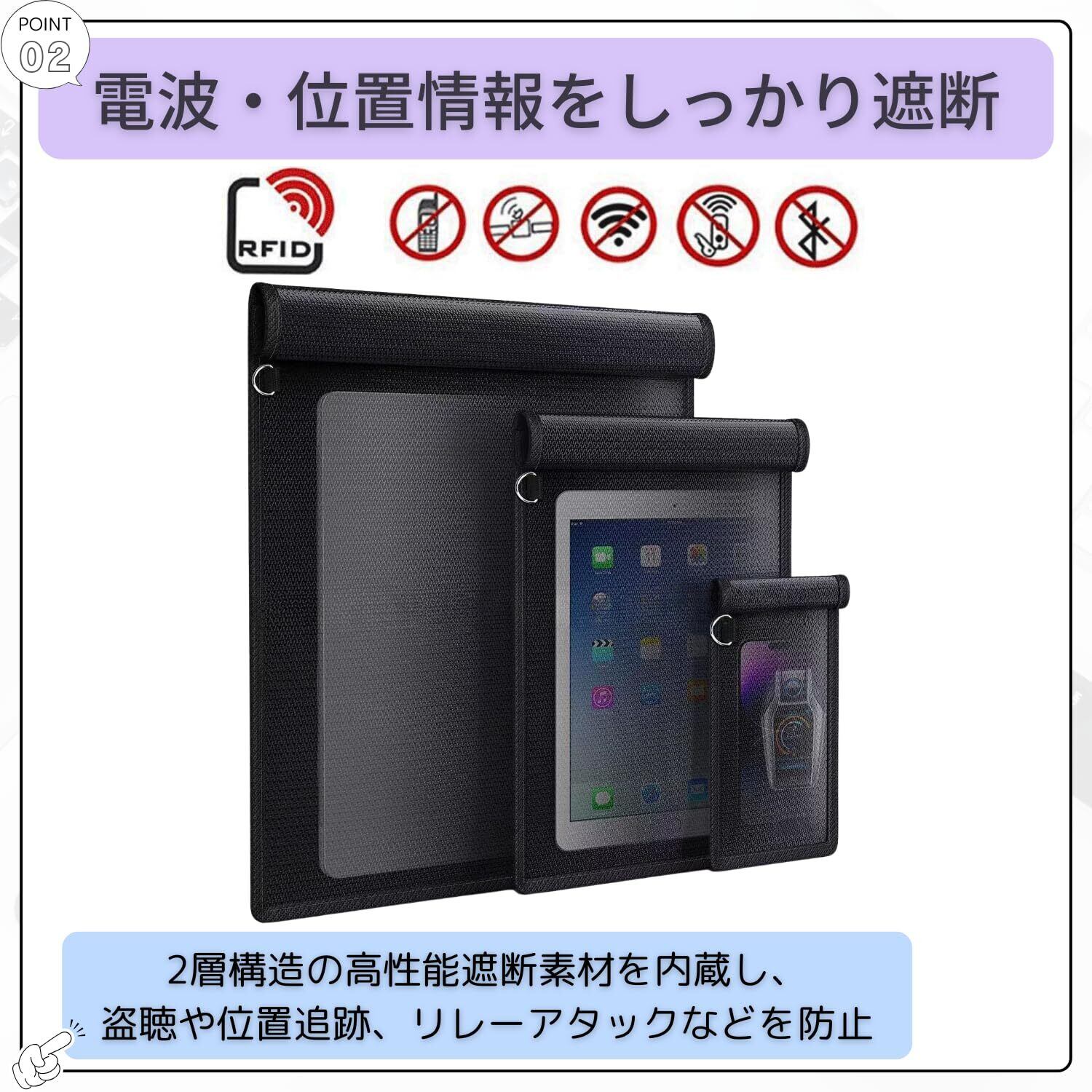 【電波・位置情報をしっかり遮断】2層構造の高性能遮断素材を内蔵し、スマホや車のスマートキーから発信される電波をブロック。盗聴や位置追跡、リレーアタックなどのリスクから大切な情報を守ります。