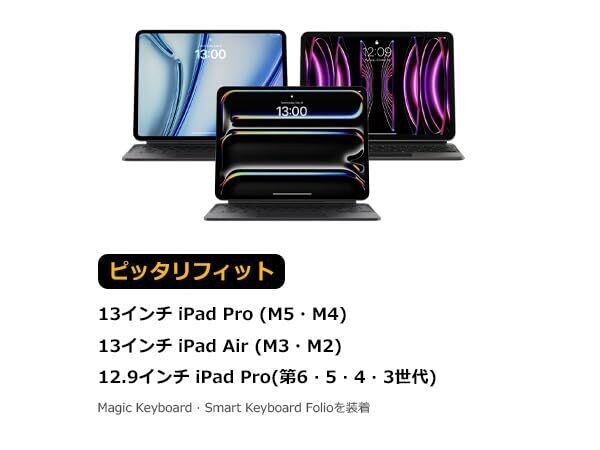 対応機種:13インチ iPad Air M4/M3/M2 2026-2024 | 13インチ iPad Pro M5-M4 2025-2024 | 12.9インチ iPad Pro 第6/5/4/3世代 M2-M1 2022-2018にMagic Keyboard / Smart Keyboard Folioまたは他のApple Pencil付きのケースを装着した場合に対応。キーボード付きの12.3インチ Microsoft Surface Pro X/7/6/5/4/3/2/1にも対応。タブレット収納部内寸: 303 x 246 x 19mm。ご注意:本商品はタブレットケースのみです。iPadデバイスおよびアクセサリーなどは商品内容物に含まれておりません。
