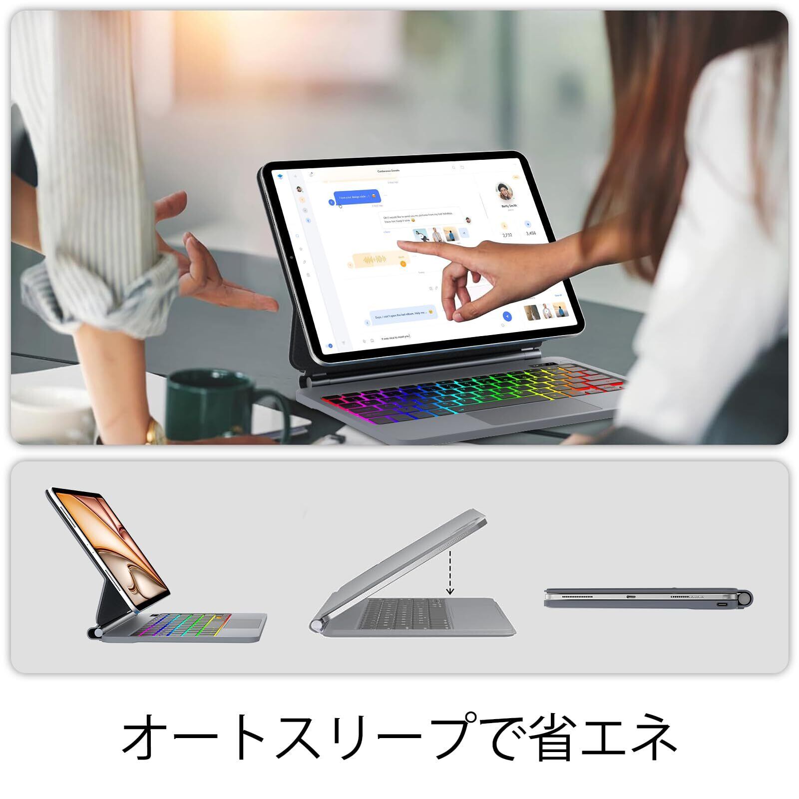 【フローティングデザイン & 無段階角度調整】 独自のフローティングカンチレバー構造を採用。iPadを磁力で浮かせ、まるでノートPCのような感覚で作業が可能です。ヒンジは無段階に調整でき、デスクワークや動画鑑賞など、横画面での使用に最適な角度を自由に見つけられます。