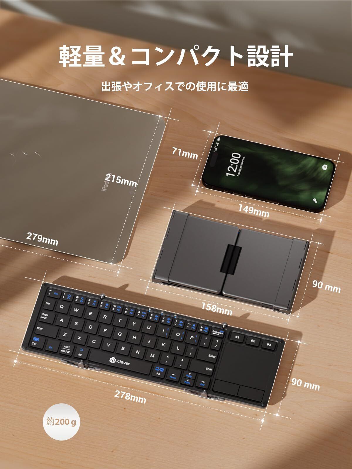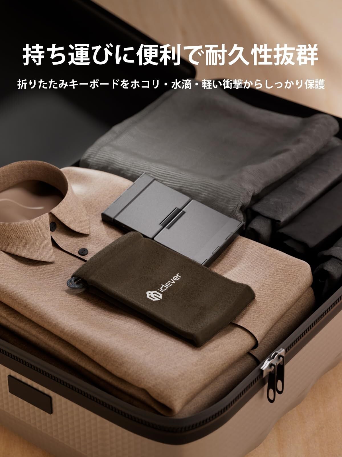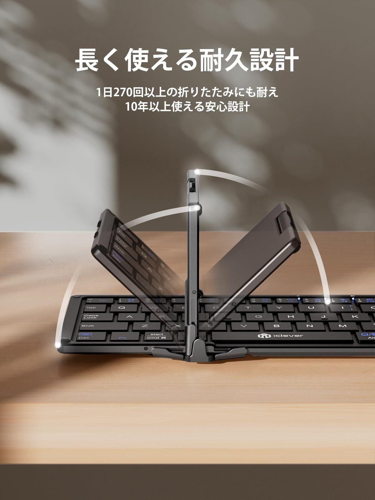 【折りたたみBluetoothキーボード・コンパクト設計】iClever BK08は三つ折り設計の折りたたみBluetoothキーボードです。一般的なトラベルキーボードより約20%小型で、ポケットやバッグに収納しやすいコンパクトサイズ。スマートフォンやタブレットをノートPCのように使える、持ち運びに便利なワイヤレスキーボードです。