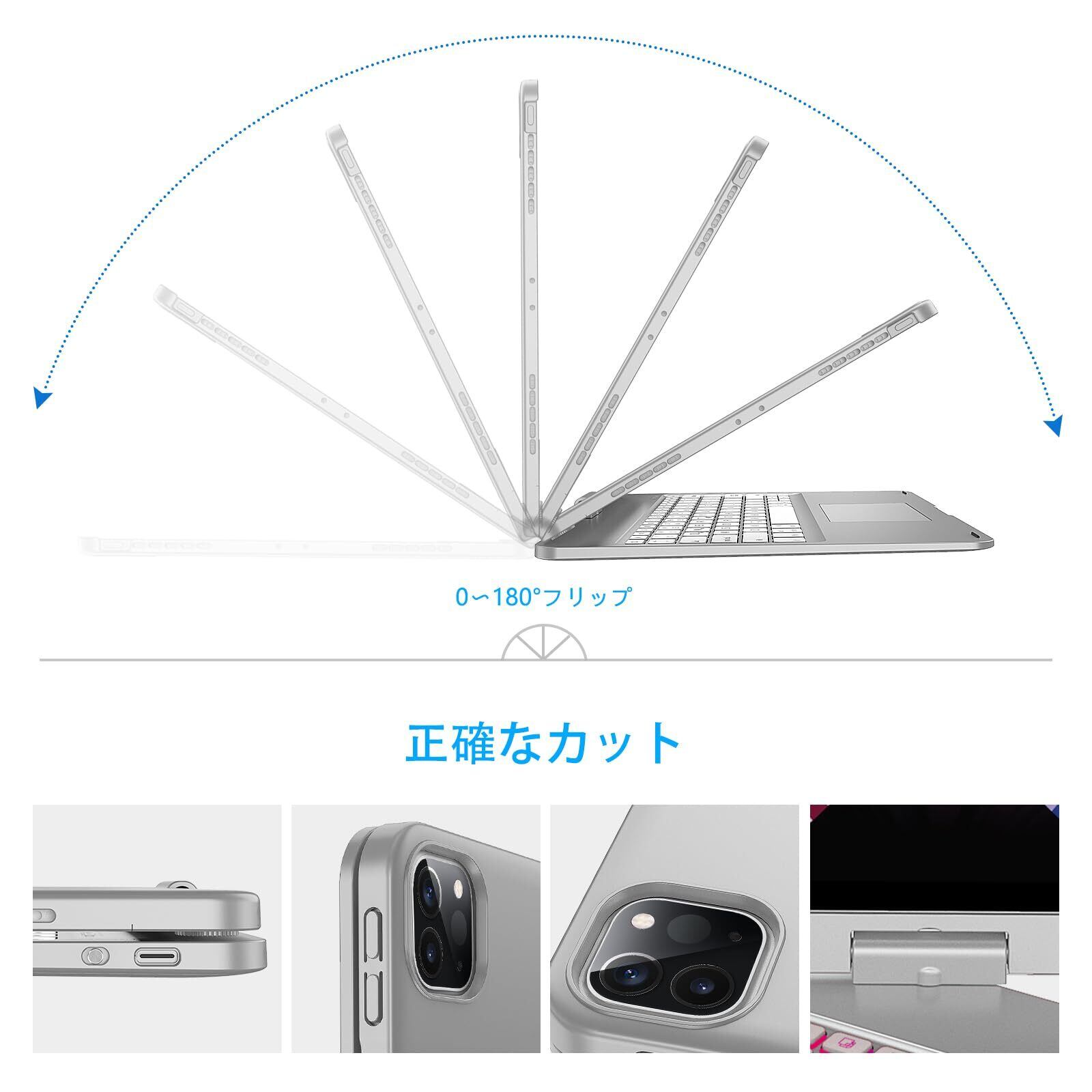 【360°回転&180°フリップ】 iPad Air13 キーボード付きケースはiPadをノートパソコンように使用できる以外に、7つの異なるモードで使用できます。どんな角度にも調整でき、画面を360度回転でき、180°裏返す操作し、横向きに立てかけて、お気に入りの番組を視聴したり、絵を描くんだり、読書、WEBなどを楽しめます。キーボードが不要な時、iPadケースを反転できます。ミーティングや仕事など実用性が高くて便利なbluetooth iPad Pro 12.9キーボードケースです。