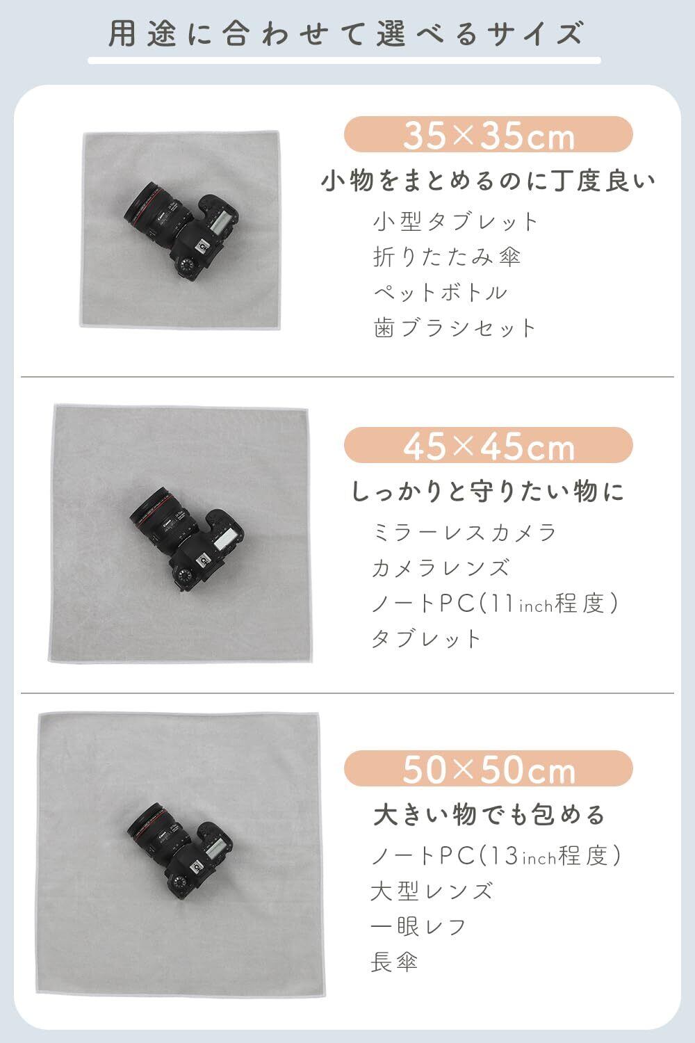 【4. 選べる3サイズで用途が広がる】35×35cm:小型タブレット、折りたたみ傘、小物。45×45cm:ミラーレスカメラ、レンズ、ノートPC(11インチ)。50×50cm:一眼レフ、大型レンズ、13インチPC、長傘。ガジェットから割れ物まで幅広く使える万能サイズ展開