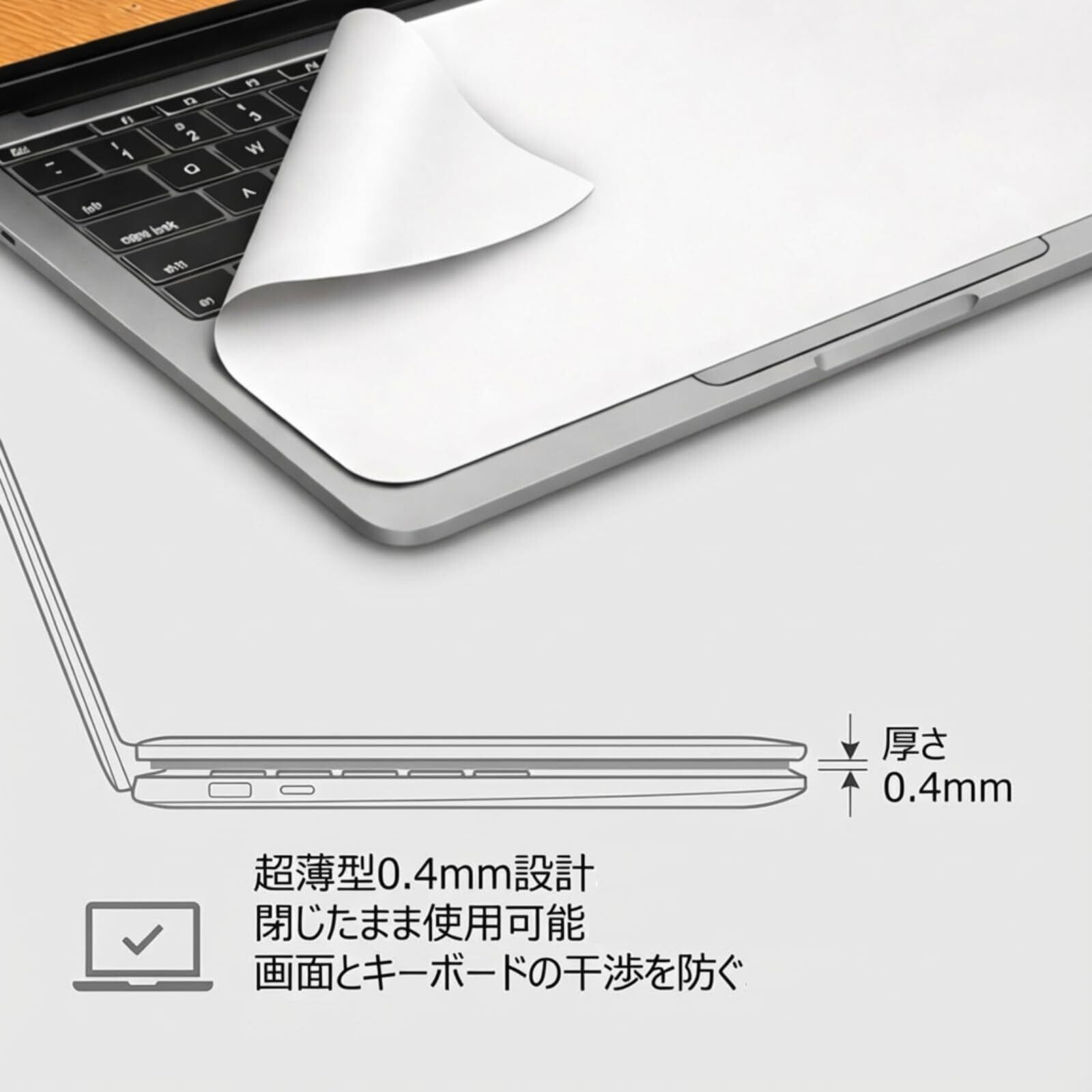 厚さ0.4mm・高密度マイクロファイバー採用、PCを閉じた際に浮きが出にくい 素材は高密度マイクロファイバー(厚み0.4mm)。PCのヒンジやキーボードとの干渉を最小化した薄さで、指紋・ほこり・油分を乾拭きで除去できます。水洗い対応で繰り返し使用可能です