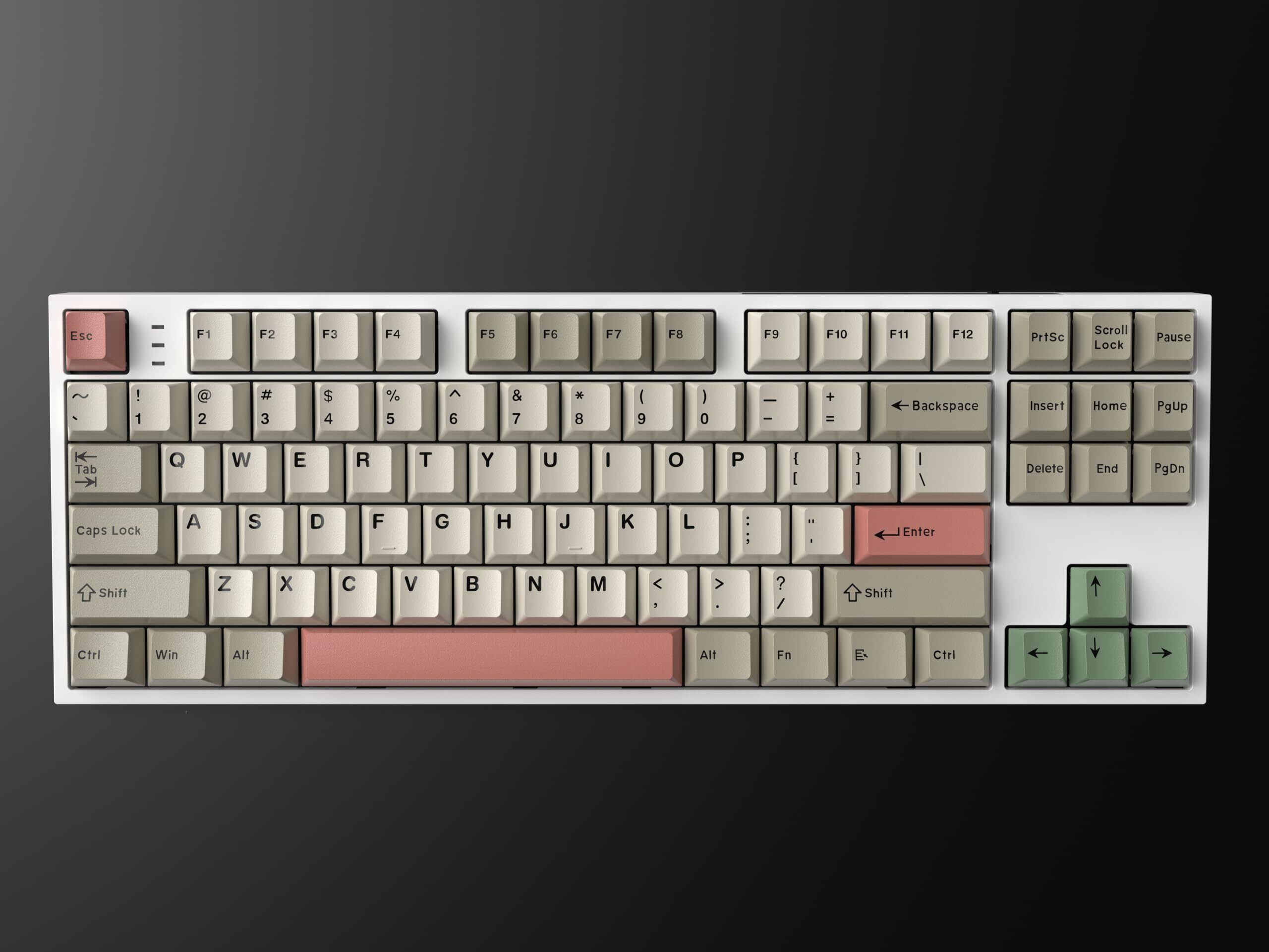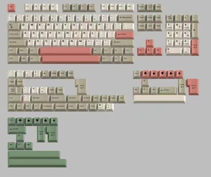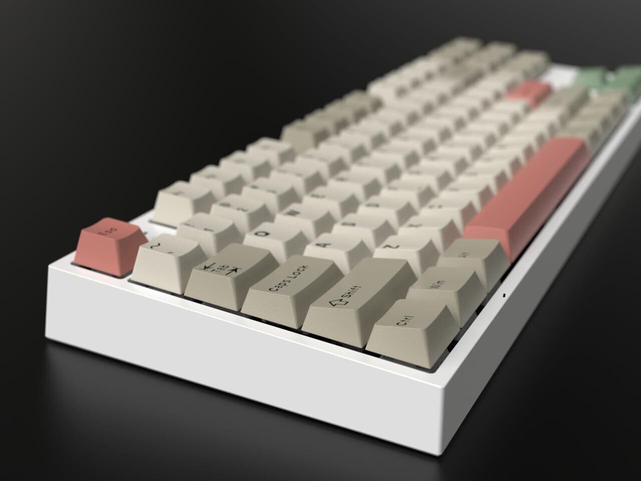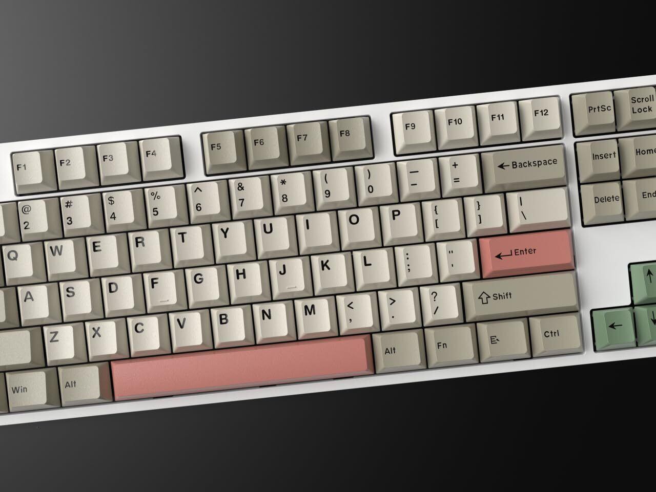 【ミニマリストキーキャップセット】ミニマリストなカラーデザイン(ベージュ、レッド、グリーン)が特徴で、シンプルかつ洗練された印象を与えます。オフィスやゲーミング環境にも調和し、自分だけのカスタムキーボードを演出できます。