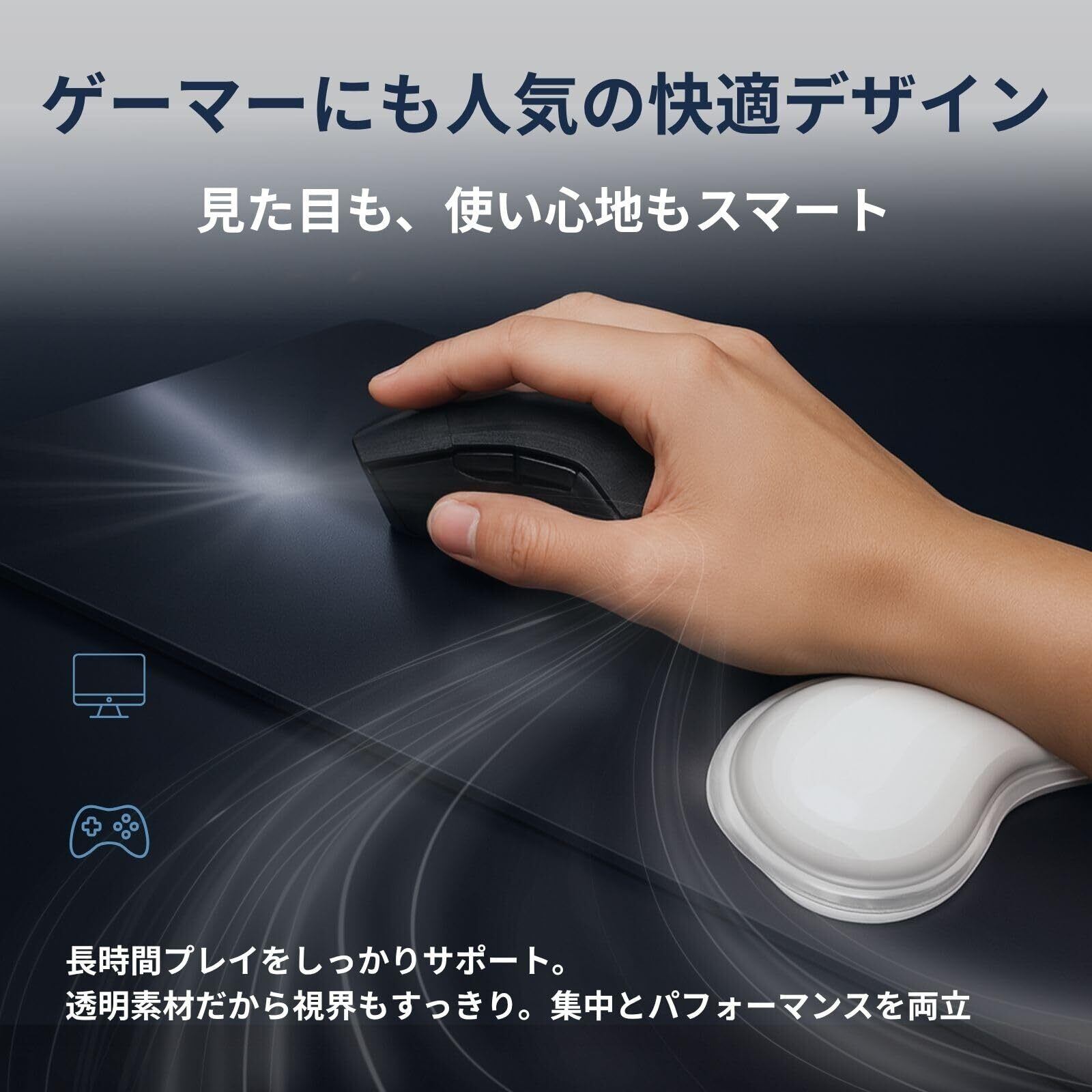 【人間工学デザインで疲労軽減】 手首を自然な位置で支えることで、長時間のタイピングやマウス操作の疲れを軽減します。