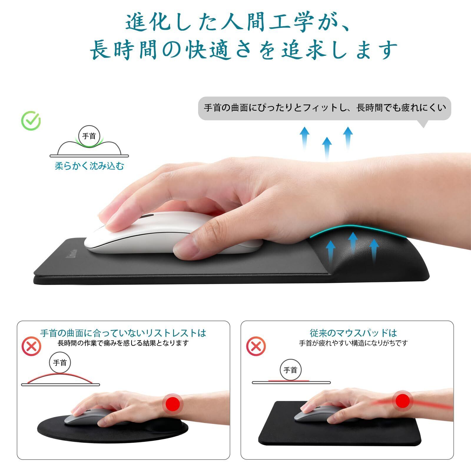 【人間工学に基づいた快適設計】 手首に当たる部分は、高反発ではなく低反発素材を採用。弾力ではなく、柔らかく沈み込む素材特性で、手首の曲面にぴったりとフィットします。これが圧力を効果的に分散し、操作時の負担を大幅にカット。長時間でも疲れにくい、理想的なサポートを実現しました。