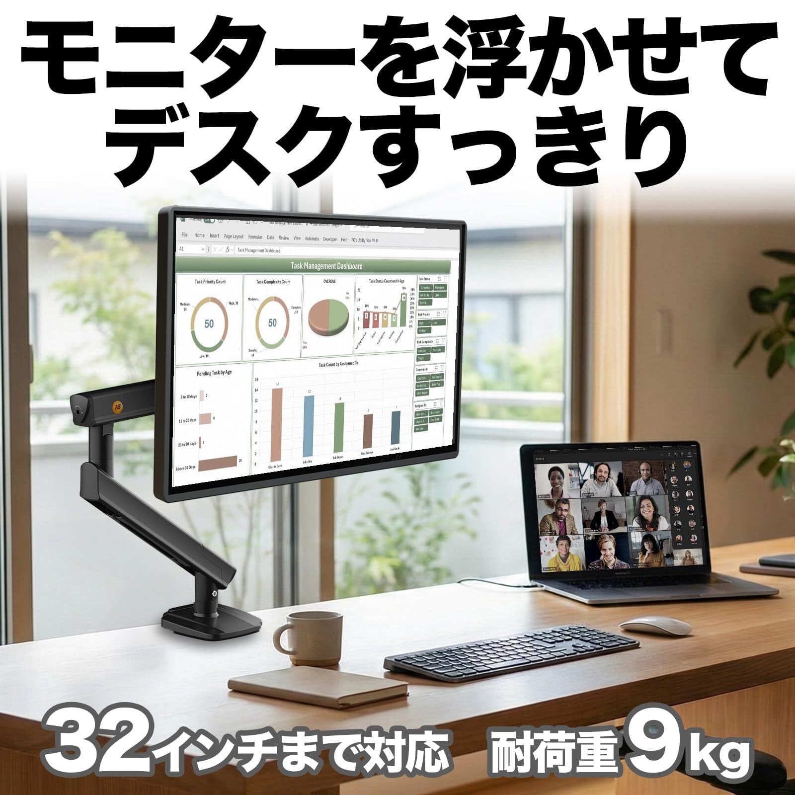 【17〜32インチ対応・耐荷重9kg】 24〜27インチはもちろん、32インチまでしっかり支える設計。ノートPCと組み合わせる外部モニターとしても安心して使えます。32インチ以上でも耐荷重以下ならお使いいただけます。