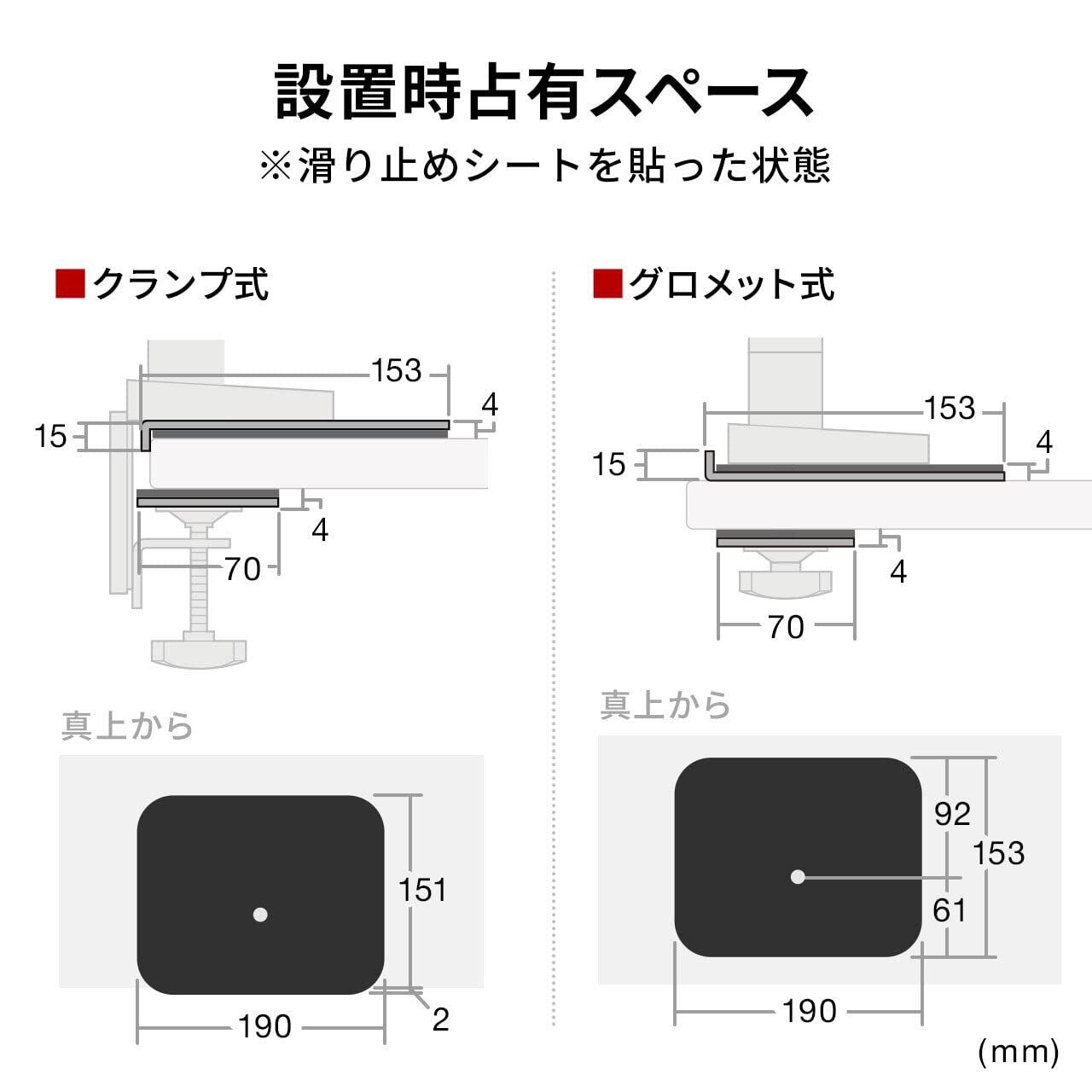 クランプ式モニターアームの他、グロメット式の2つの設置方法に対応しています。