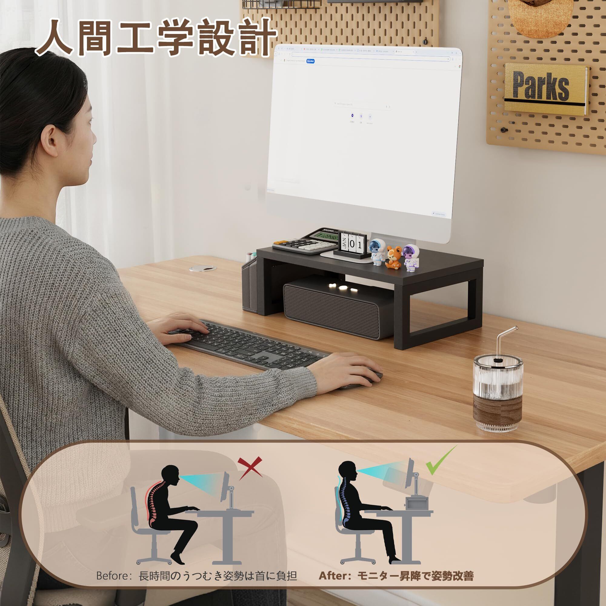 【頑丈でたわみ防止】 重厚な鋼製ベースと高品質パーティクルボード製のモニターラック。非常に頑丈で安定し、約30kgを支え、たわみや揺れの心配はありません。各脚の滑り止めパッドがデスク 台を保護。