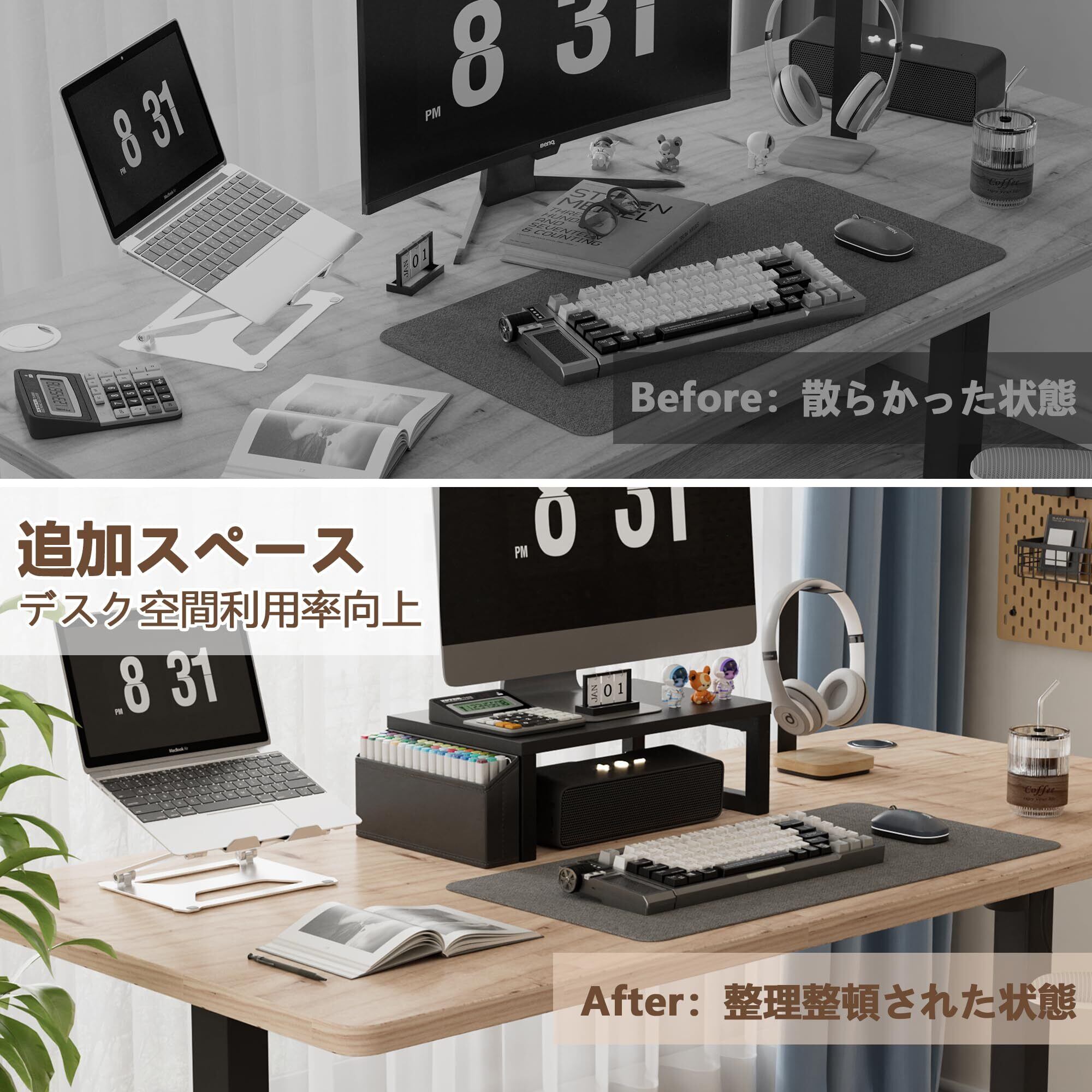 【コンパクト設計】 パソコン モニター台 卓上のサイズは40cm(幅)×23.5cm(奥行)×13.5cm(高さ)。この小型pc台 卓上は27インチディスプレイ 台1台をスリムに収納。限られたスペースでもすっきり使える、小規模オフィスに理想的な卓上収納です。