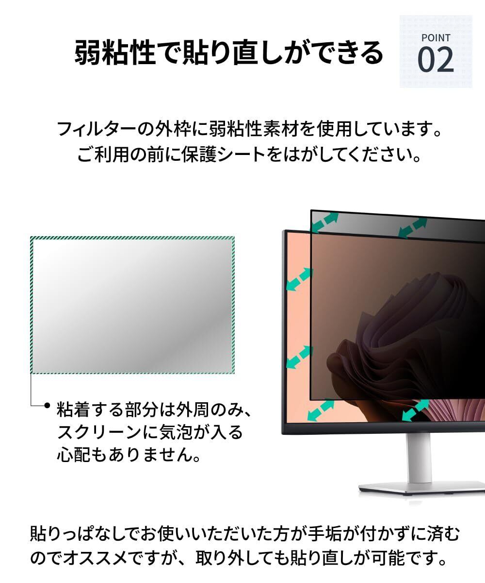 [ アンチグレア ] 本製品はマットな質感のアンチグレア(反射防止・非光沢)仕様で、蛍光灯や室内の光源による映り込みをやわらげます。ただし、モニター本体がすでにアンチグレア仕様の場合に、さらに強い反射防止加工を重ねると、画面が白っぽくなったり見えづらくなることがあるため、あえて過度なアンチグレア加工は施しておりません。そのため、すでに反射防止機能のあるモニターと比較すると、本フィルターの反射防止効果は控えめに感じられることがあります。これは、のぞき見防止機能と視認性のバランスを最適化するための設計です。画面の鮮明さと覗き見防止性能を両立したい方におすすめです。