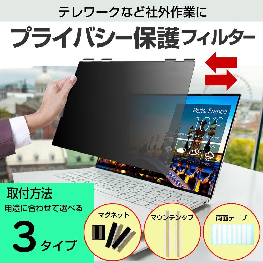 3通りの取付方法。1.マグネットアタッチメントでの装着方法。プライバシーフィルターを液晶画面の表示領域に合わせて、アタッチメントを取り付ける場所(4か所)の位置を決定します。 ※モニターの大きさに応じて、必要なアタッチメントの数を調整してください。 取り付け位置が決まりましたら、粘着テープ付きの鉄製プレートをプライバシーフィルターの上部に貼り付けます。 ※鉄製プレートとマグネットパーツが重なるように、モニターの天辺にマグネットを貼り付けてください。 鉄製プレートとマグネットを重ねて、取り付け完了です。 2.両面テープでの装着方法。付属の両面テープを四隅に貼って画面に取り付けるだけの簡単装着。 3.マウンティングタブでの装着方法。透明タブを液晶画面のフチに貼り付け、フィルターを上からスライドして装着。