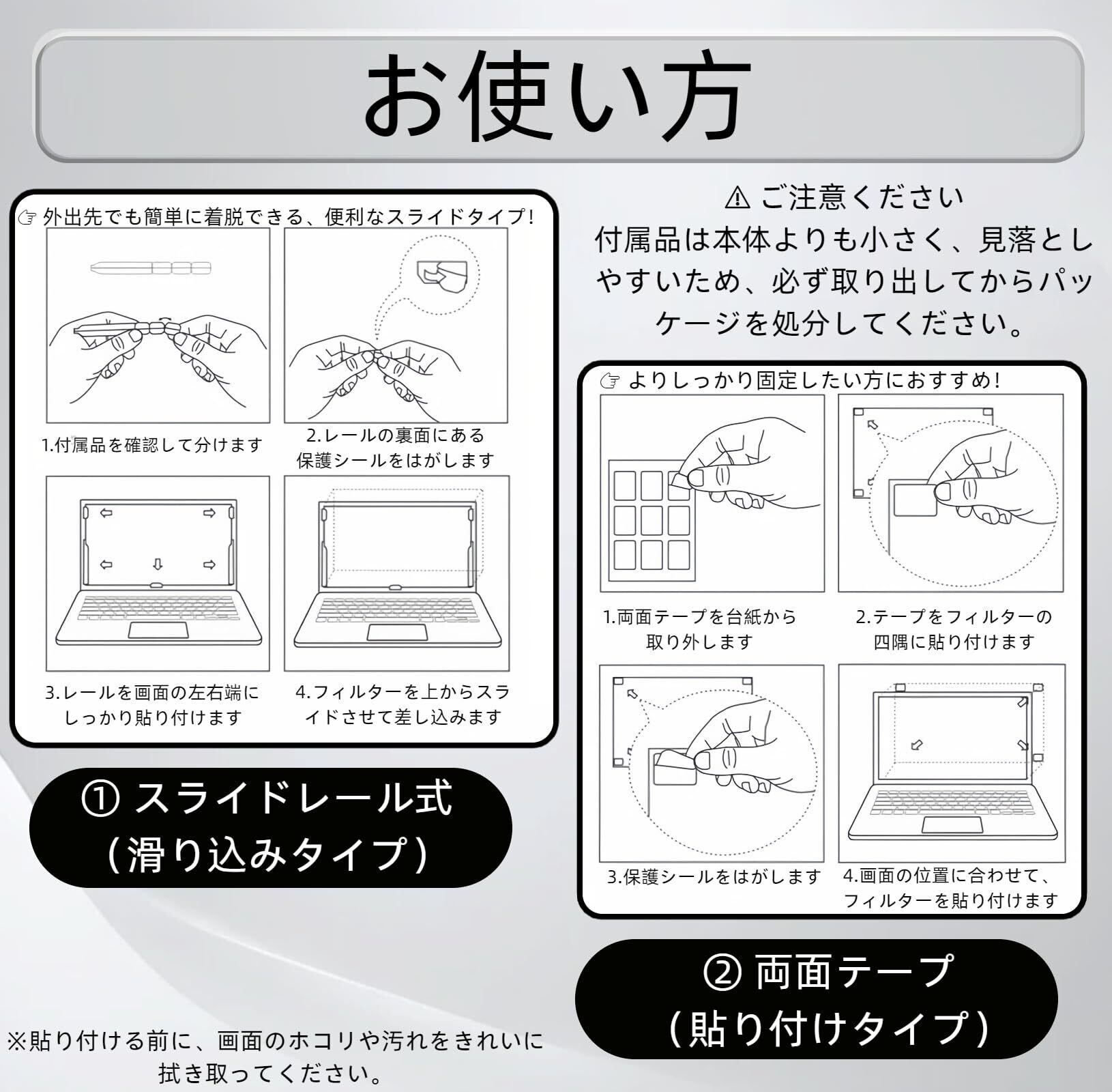 【取付方法2種類・差し込み式&テープ固定式】安定した装着が可能です。スライド式で簡単に着脱でき、両面テープ式ではしっかりと固定可能。マグネットタイプとは異なり、磁力不足によるズレや浮きがなく、幅広いノートパソコン・モニターに対応。