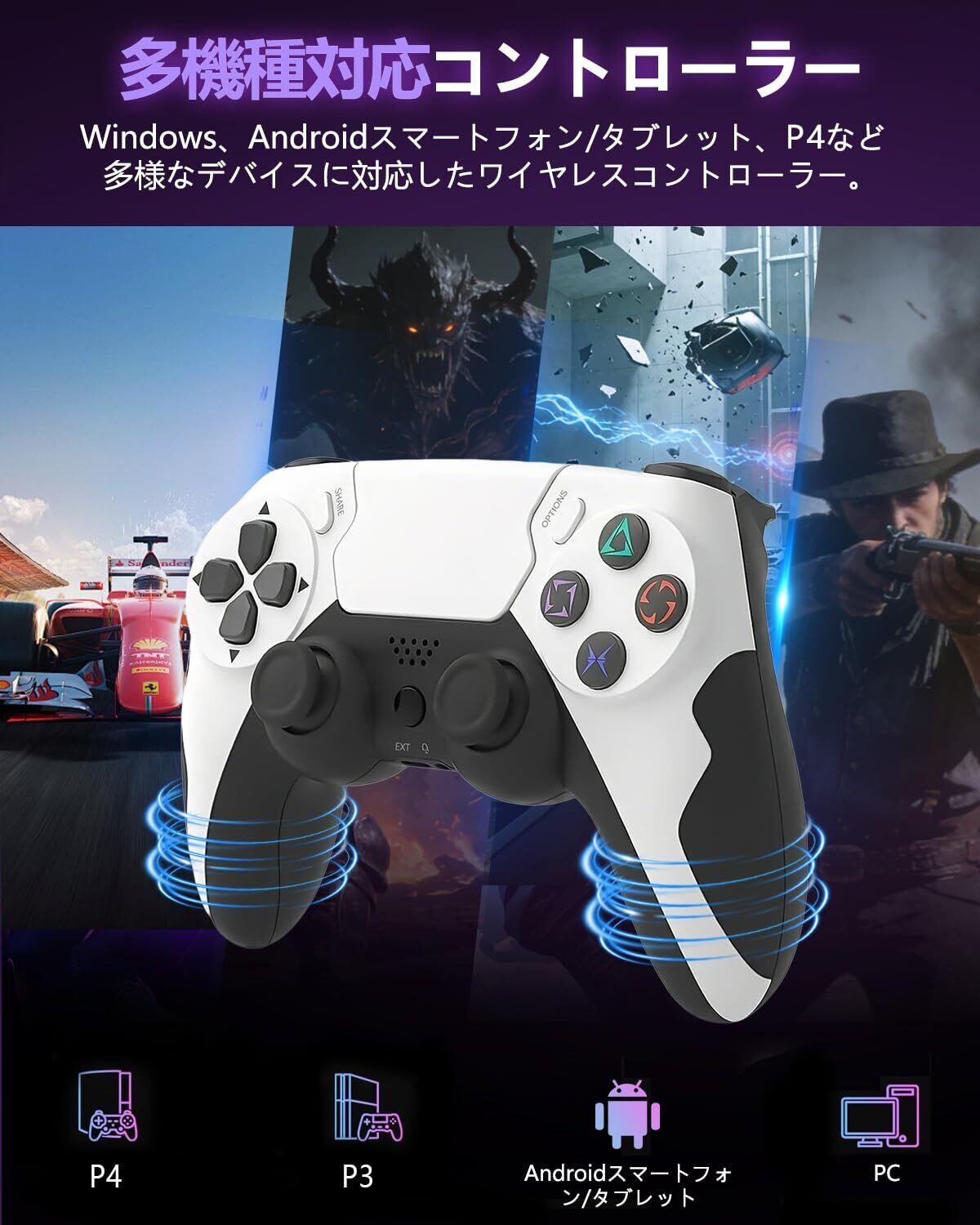 一台で全てのゲーム体験を革新する、次世代マルチプラットフォーム・ワイヤレスコントローラー お手持ちのゲームデバイスが増えるたび、コントローラーも増えていませんか? スマホ、PC、据え置き機… それぞれに最適な操作デバイスを探す煩わしさから解放される時が来ました。この ワイヤレスコントローラー は、あなたの全てのゲームライフを一つの“相棒”に統合し、あらゆるプラットフォームで最高の操作性と没入感を約束します。 すべての機器をつなぐ、真のマルチプラットフォーム対応 この一台が、あなたのゲーム環境の中心となります。Androidスマホ/タブレット、Windows PC(7/8/10/11)、さらにはP3および P4 まで、シームレスに接続可能。Bluetooth技術により、ケーブルの束縛から解き放たれ、リビングでも書斎でも、所有するあらゆるデバイスを自由自在に操れます。従来の P4コントローラー や PCコントローラー を超え、全てのゲームシーンに対応する唯一無二の入力デバイスです。 プレイを中断させない、圧倒的な持続力 長時間の没入を妨げる最大の敵——それは「充電切れ」です。本製品は大容量バッテリーを内蔵し、最大20時間もの連続プレイを実現。さらに、わずか2時間の急速充電でフル充電が完了するため、待ち時間は最小限に抑えられます。低電圧アラート機能が充電切れを事前に警告するため、戦いの真っ最中に操作不能になる心配はありません。旅先でも、週末のマラソンプレイでも、安心してゲーム世界に没頭できます。 臨場感を最大化する、プロ仕様のマルチ機能 単なる入力機器ではなく、ゲーム体験そのものを高める機能が満載です。状況に応じて繊細に振動する双振動モーター、効果音やBGMの臨場感を増幅する内蔵スピーカー、そしてお好みのヘッドセットに対応した3.5mmオーディオジャック。直感的な体感操作を可能にする6軸ジャイロセンサーは、FPSの精密な照準やレーシングゲームのハンドル操作に新たなリアリズムをもたらします。専用シェアボタンで、勝利の瞬間や感動的シーンを即座に記録・共有。五感に響く、次元の違う没入体験をお届けします。 シーンに応じて最適化、有線/無線デュアルモード eスポーツなど、一瞬の遅延が勝敗を分ける競技シーンでは、USB-C有線接続で「応答ゼロ」の超低遅延環境を実現。くつろいでのんびりプレイしたい時は、10メートルの広範囲をカバーする強力なBluetooth無線接続にワンタッチで切り替え。ソファやベッドで、最もリラックスできる姿勢でゲームを楽しめます。複数デバイスの登録・切り替えも簡単なので、PCコントローラー として使用中に、すぐにスマホゲームに切り替えることも可能。まさに、ワンタッチで世界が変わる柔軟性です。 ✨ 手に馴染み、長時間でも疲れない人間工学デザイン 最後に、全ての性能を支えるのは「究極のフィット感」です。手のひらの形状を徹底研究した人間工学デザインにより、自然な握り心地を実現。表面にはテクスチャードグリップを採用し、両端には確かなグリップ感を保つ滑り止め加工を施しています。手汗をかく激しいバトルや、長時間に及ぶ探索の中でも、コントローラーは確実に手にフィットし、あなたの意のままに動きます。これは、単なる ワイヤレスコントローラー を超えた、あなたの手足となるパートナーの誕生です。