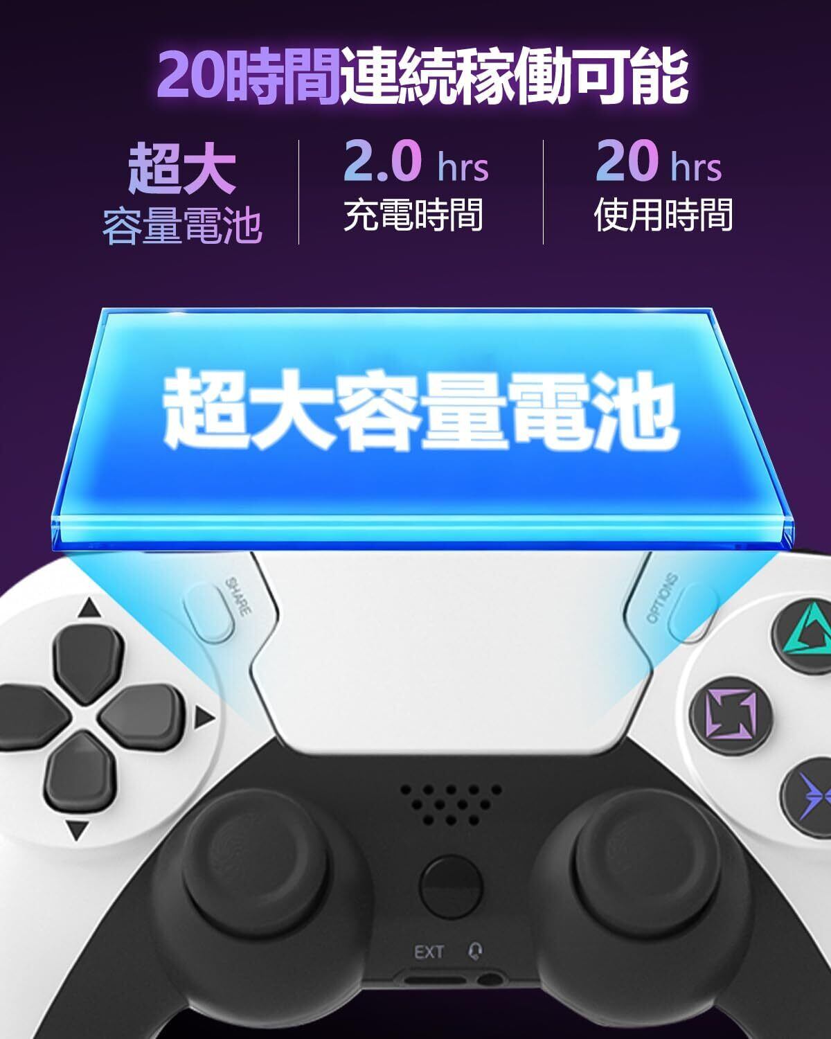 【超長続航 + 急速充電|中断なきプレイ】 コントローラーに大容量バッテリーを内蔵し、最大 20 時間の連続プレイを実現! たった 2 時間の急速充電でフル充電完了、ゲームの流れを長時間途切らせることなく没入感を維持。さらに低電圧アラート機能を搭載 —— バッテリー残量が低下すると本体インジケーターランプが点滅警告!p4 コントローラーやpc コントローラーとして使用時も、予期せぬ充電切れを防ぎ、安心してプレイに集中できます。