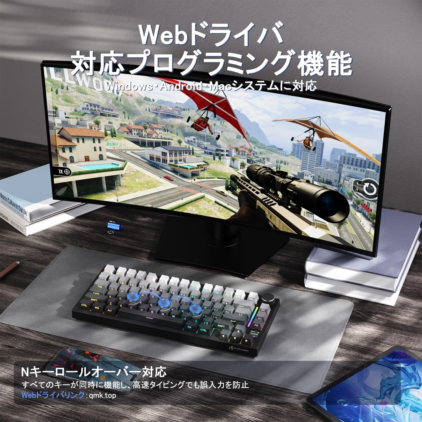 技適番号:219-259234【三模接続とホットスワップ対応で自由度抜群】Bluetooth・2.4G無線・有線接続に対応し、PC、ノートPC、タブレット、スマートフォンなど幅広い機器で使用可能。ホットスワップ対応により、工具を使えば自分好みの軸へ簡単に交換でき、音や打鍵感を自由にカスタマイズできます。標準で鮫軸(クリック感強め)とギフト軸(打鍵音がまろやか)の2種類をラインナップ。eスポーツゲーマーからプログラマー、デザイナーまで幅広いユーザー層に対応できる設計で、自分だけの理想的な打鍵体験を追求できます。