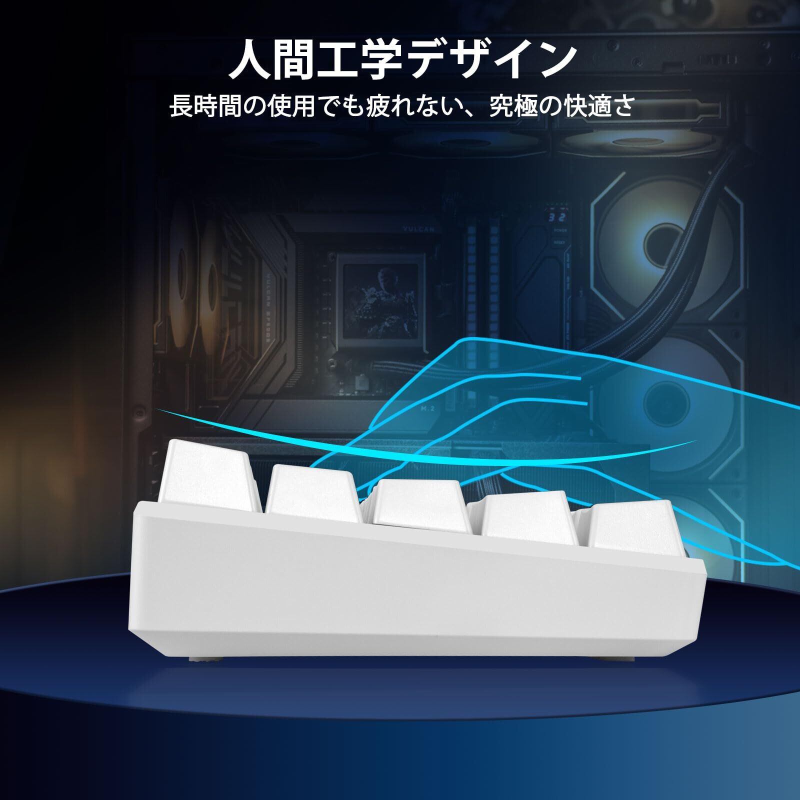 【人間工学に基づく疲れにくい設計】段階的に配置されたキーキャップが、手指を自然なポジションに導いています。軽やかなタッチ感と相まって、長時間の使用でも手首や指への負担を軽減できます。ゲームから事務作業まで、安定した快適さを保ちます。