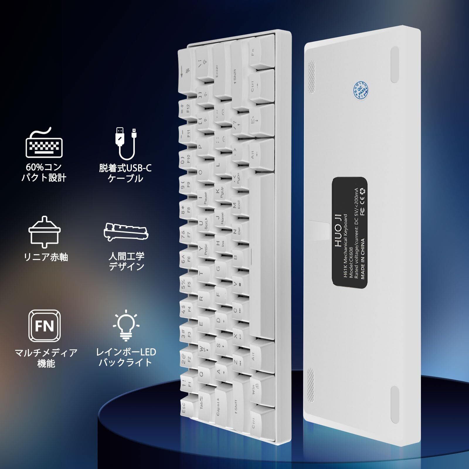 【人気商品】HUO JI 60% メカニカルキーボード USB有線 赤軸 ゲーミング 英語配列 静音 高速応答 テンキーレス レインボーLEDバックライト コンパクト パソコンキーボード Windows/Mac/ PS5対応 (ホワイト)