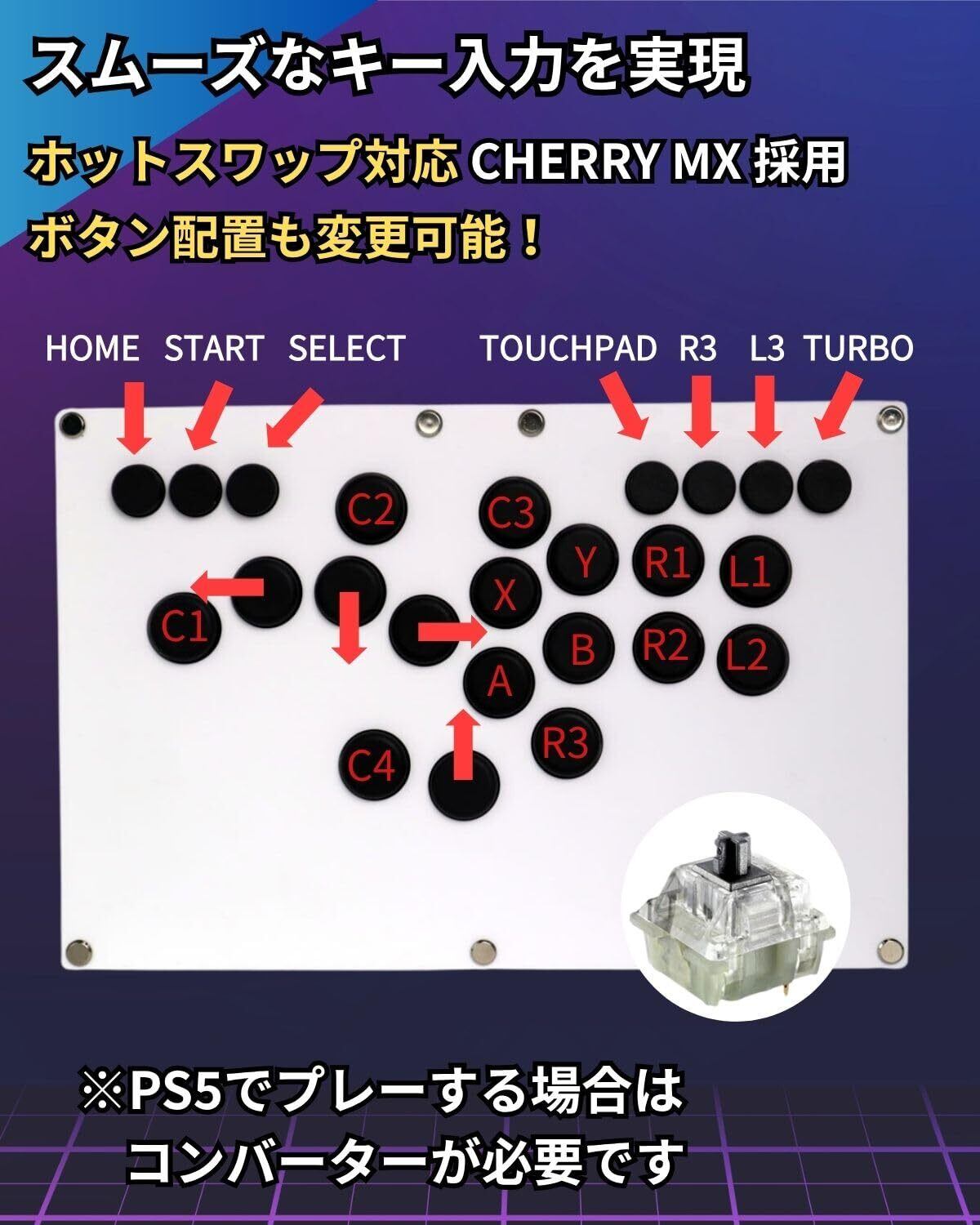レバーレスレイアウト+ ホットスワップ対応Cherry MX Blackキースイッチで入力遅延なし。