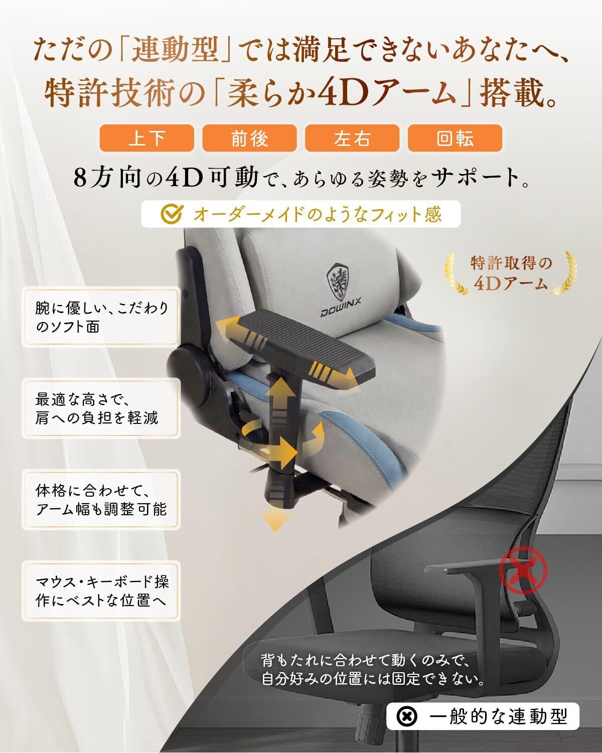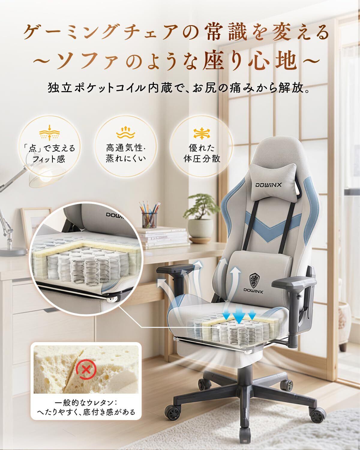 【新春セール】Dowinx ゲーミングチェア ファブリック オットマン付き 165°リクライニング オフィスチェア パソコンチェア 4Dアームレスト フットレスト デスクチェア ゲーム用チェア ポケットコイル グレー 椅子 LS-66D68B-01