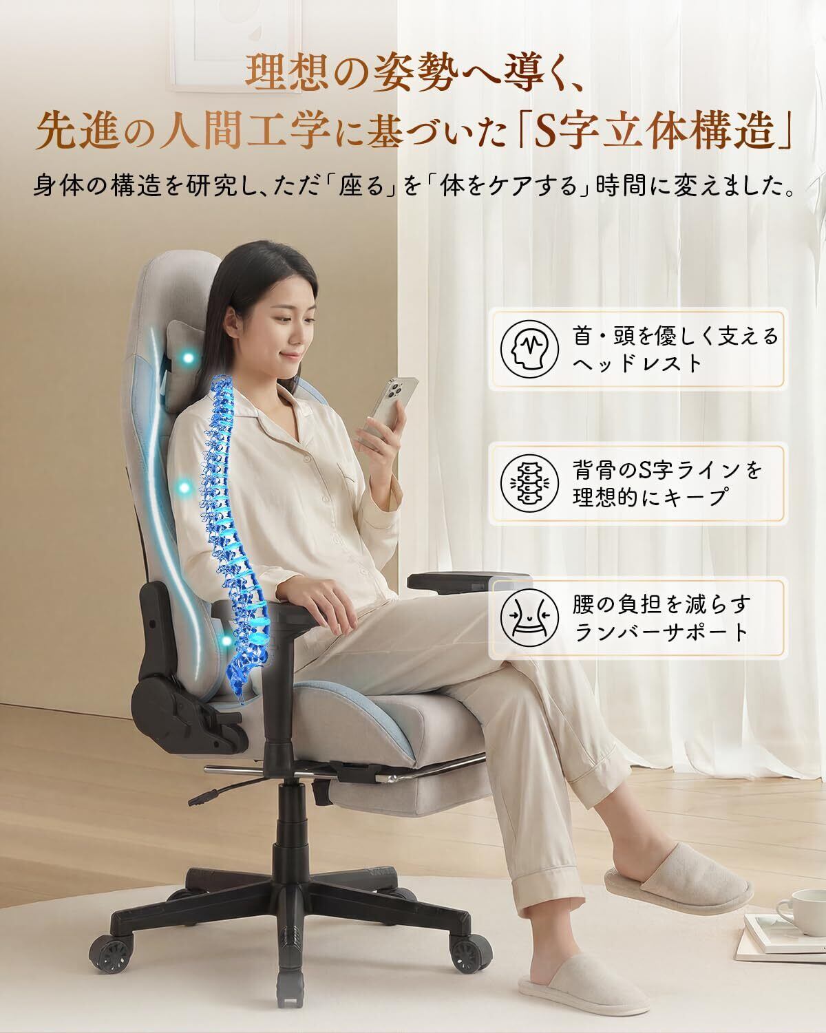 【高級ソファーの座り心地を再現】 ゲーミングチェアカテゴリの中でも唯一、高級ソファーで採用されているコイルスプリングクッションを採用しています。硬すぎず、柔らかすぎず、弾力のあるスプリングで体重をバランスよく支えてくれます。座る部分にかかる圧力を軽減し、S字型の背もたれとランバーサポートは腰椎を保護します。これにより、仕事、pcゲーム、勉強、テレワークなどで疲れず、快適な座り心地を実現しました。