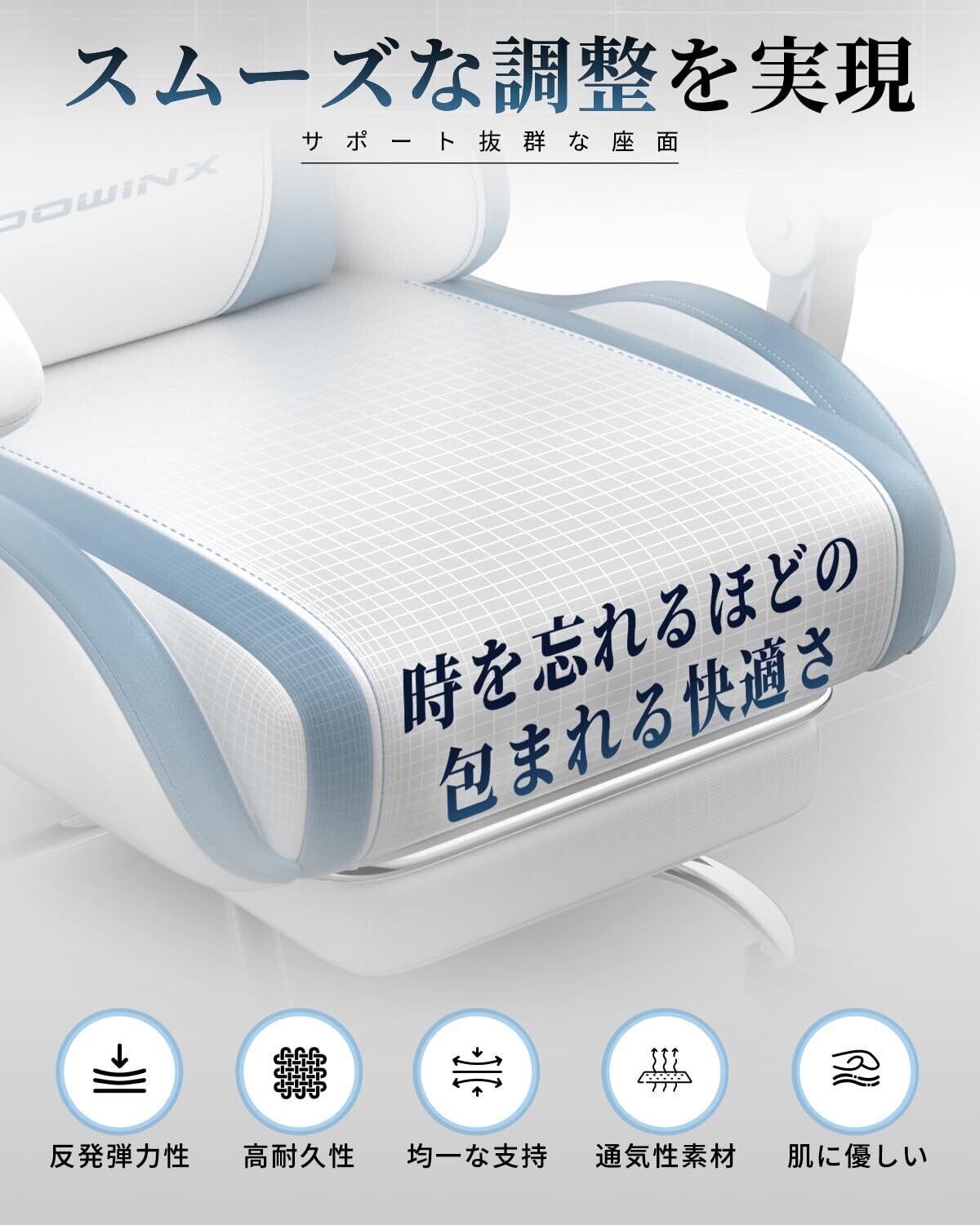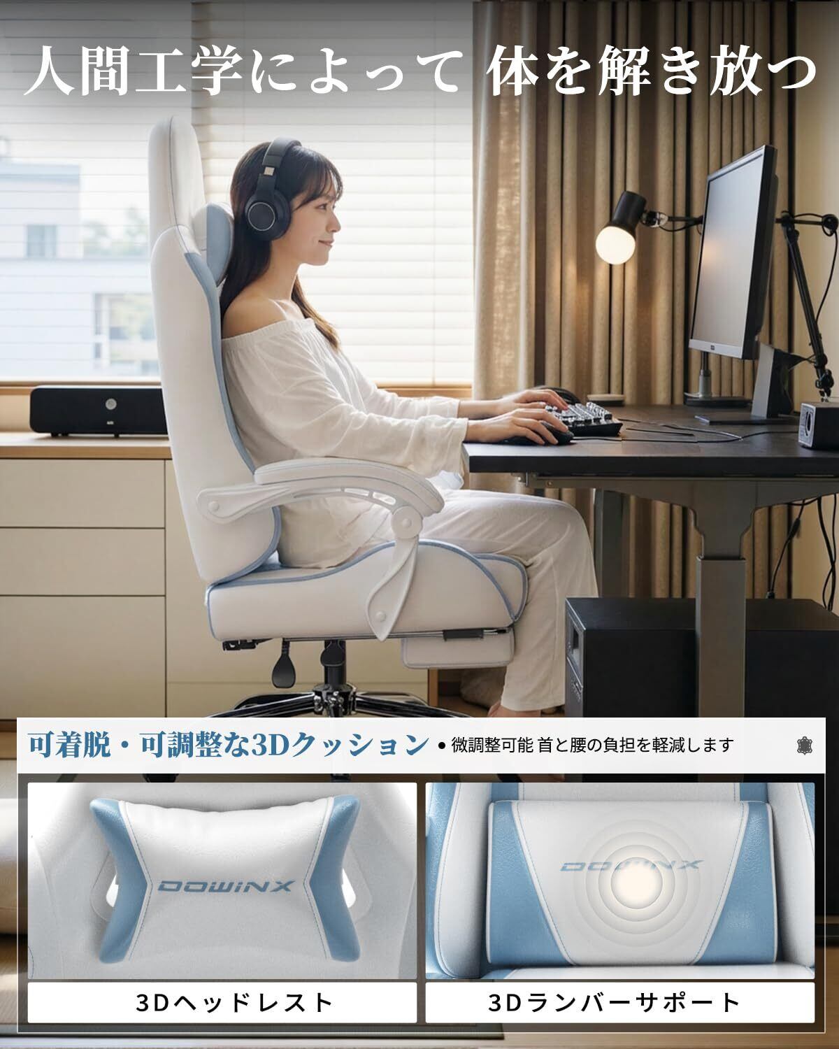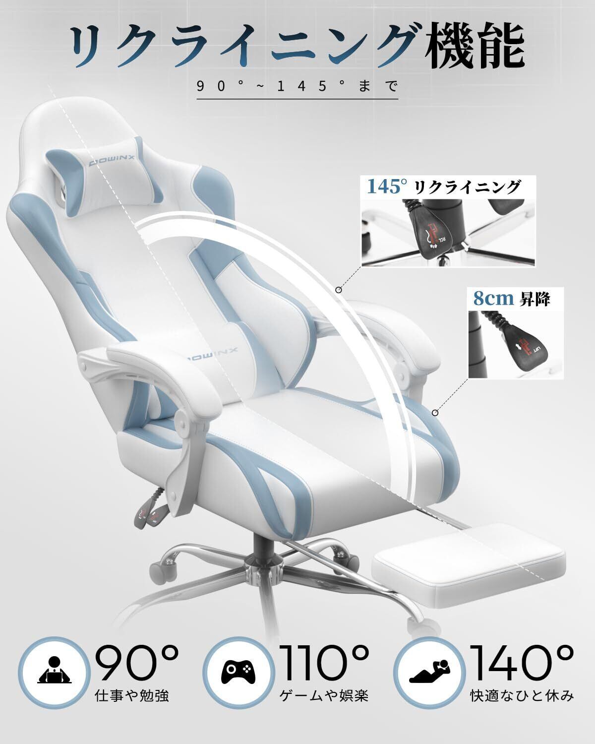 【特価セール】Dowinx ゲーミングチェア ゲーム用 PUレザー 通気性 フラットな座面 オフィスチェア オットマン ヘッドレスト 腰当て付き テレワーク 勉強椅子 椅子 145°リクライニング 高さ調節 疲れない 人間工学 ソファー座り心地 在宅ワーク リモート 腰痛対策 ホワイトとブルー LS-66D58F-04