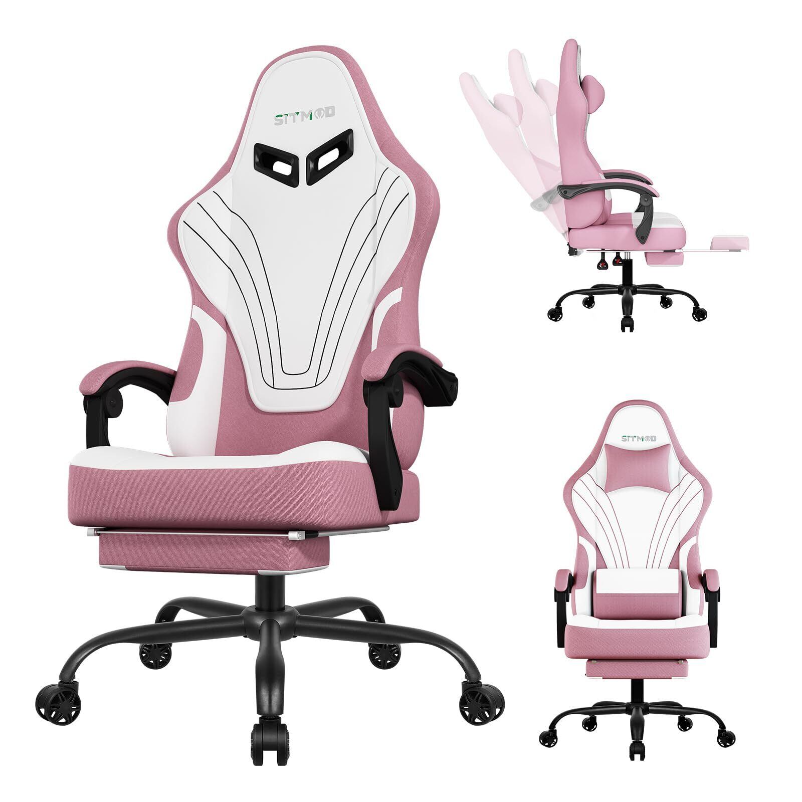 SITMOD フットレスト付きゲーミングチェア、人間工学に基づいた設計、ヘッドレスト・ランバーサポート付きオフィスチェア、高さ調節可能 ファブリック素材、ピンク