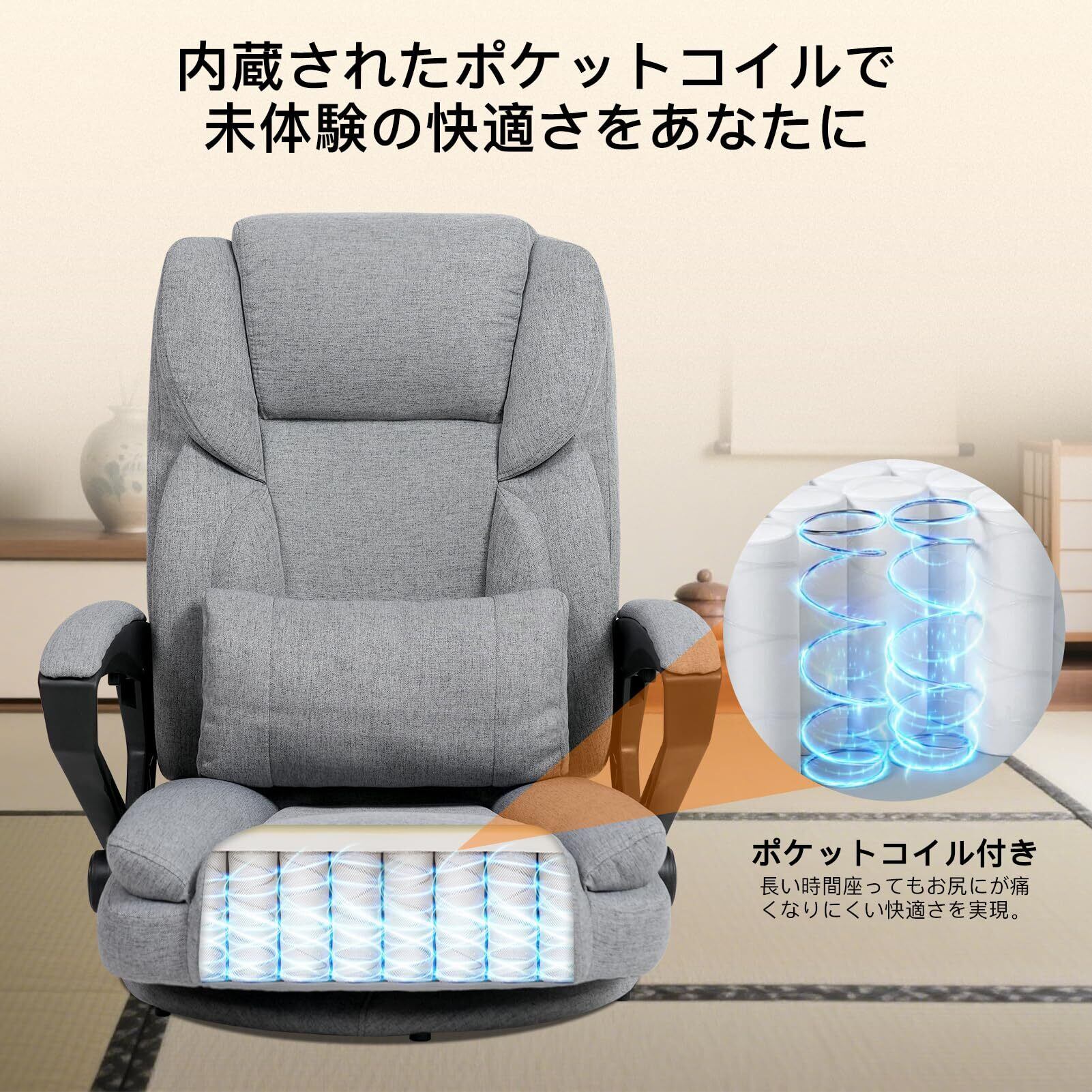 ゲーミングチェア ゲーミング座椅子 ファブリック 布地 通気性 蒸れない 腰が痛くならない 360°回転座椅子 ポケットコイルが内蔵 デスクチェア ランバーサポート ひじ掛け付き 150°リクライニングチェア LX-08SW (ファブリック, グレー)