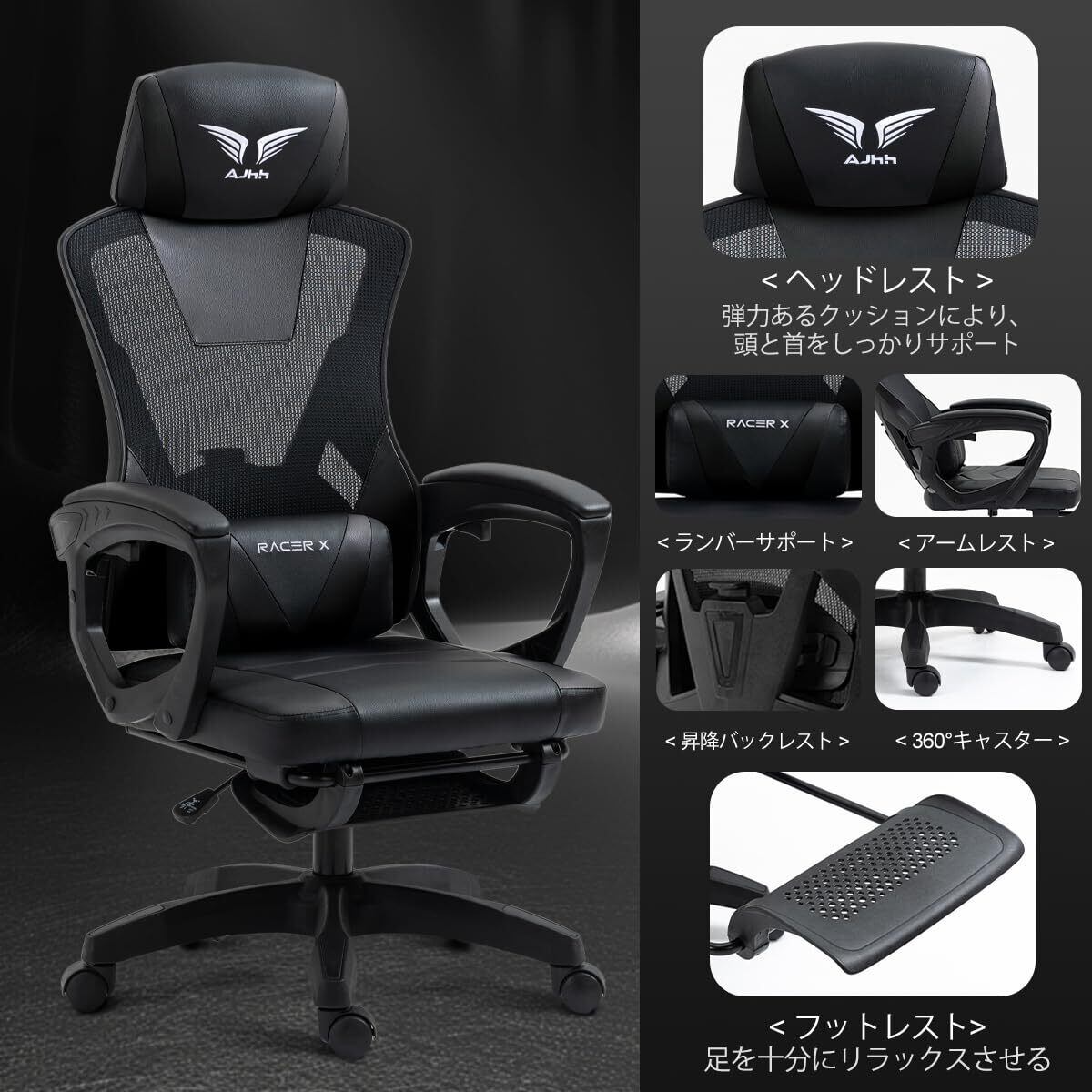 ゲーミングチェア メッシュ素材 げーみんぐチェア 通気性 リクライニング機能 オフィスチェア 135°ゲームチェア 高級PUレザー オットマン付き
