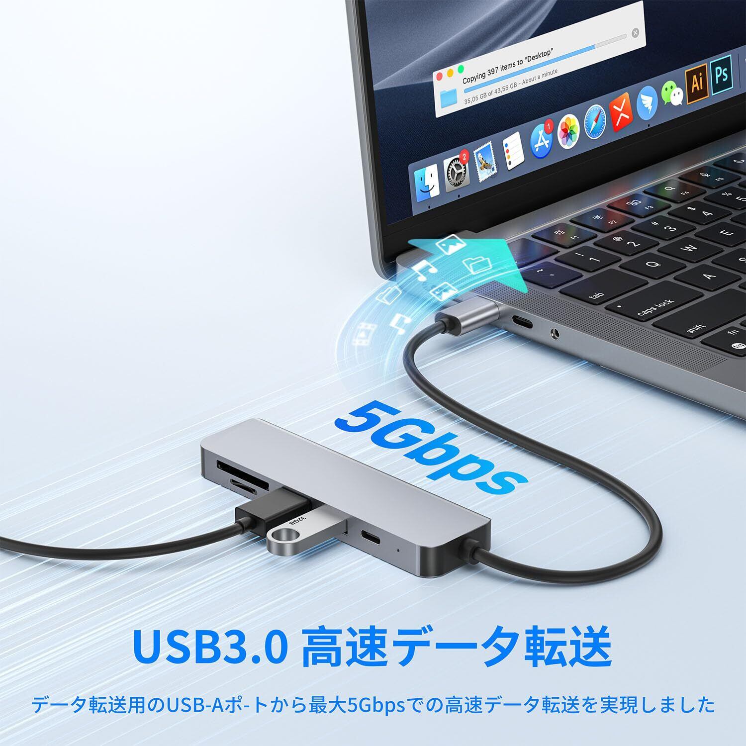 【高速データ転送とSD&TFカードリーダー】:USB C アダプタのUSB 3.0ポートは高速なデータ転送速度を提供し、ファイルの高速転送、データのバックアップ、外部ストレージデバイスの接続が可能です。USBフラッシュドライブ、ハードディスク、その他のUSBデバイスに保存されているファイルやメディアに簡単にアクセスしたり共有したりできます。また、このハブはSDカードスロットとMicro SDカードスロットが搭載されており、ストレージカードを挿入してデバイス間でファイルの転送が可能です。これは、写真家、ビデオグラファー、大量のメディアファイルを頻繁に転送する必要がある他のユーザーにとって非常に便利です。