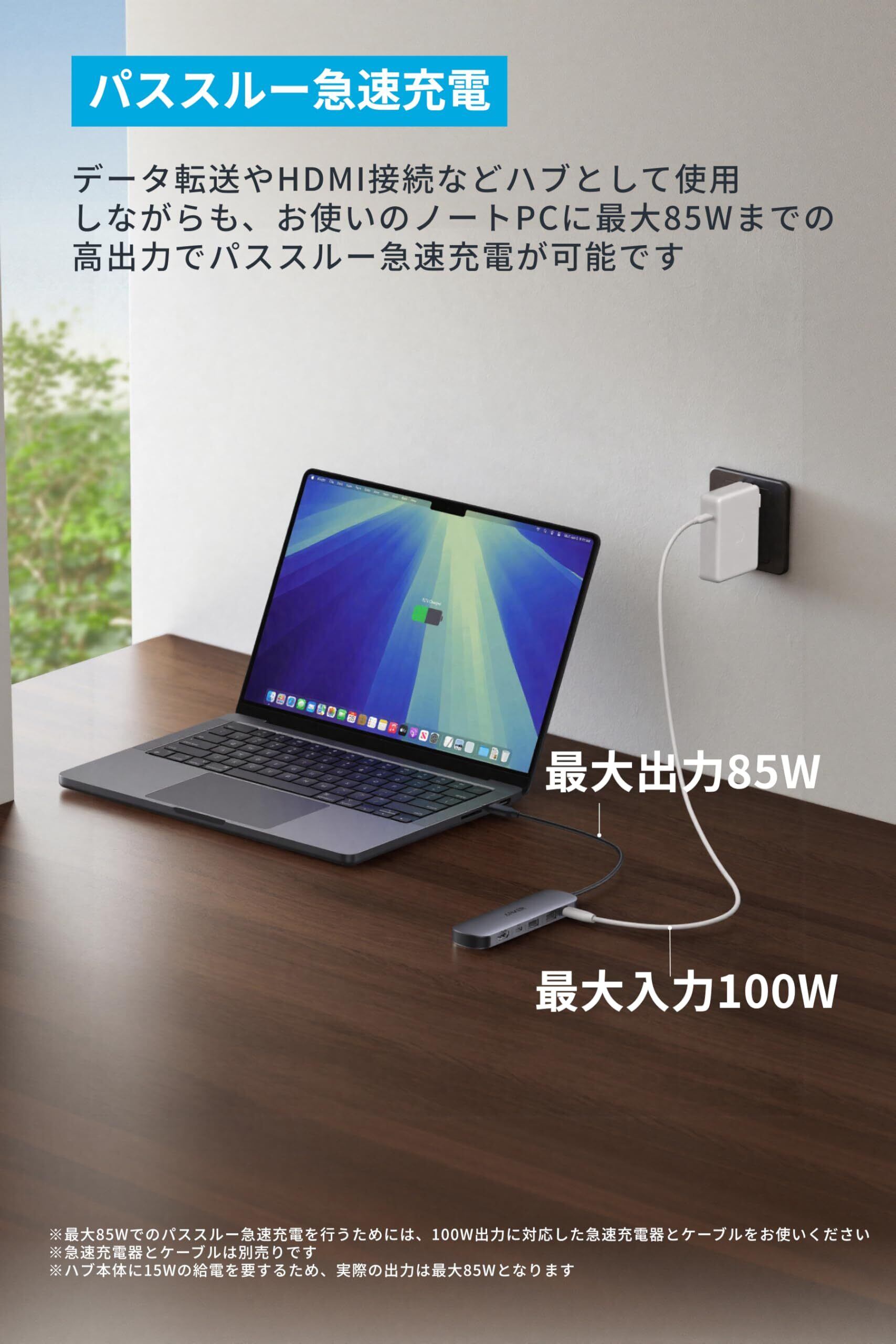 パススルー急速充電:データ転送やHDMI接続などハブとして使用しながらも、お使いのノートPCに最大85Wまでの高出力でパススルー急速充電が可能です。