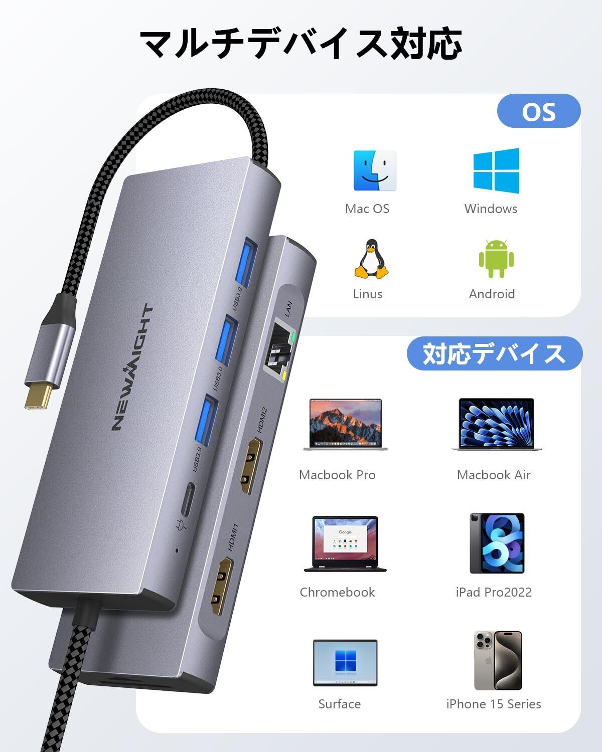 【9-in-1 lanポート】usb ハブ type-c lan 9-in-1は(4K HDMIポート*2、ギガビットイーサネットポート*1、USB 3.0ポート*3、USB-C充電ポート*1、SDカードスロット*1、TFカードリーダー*1、)があり。USB-CからHDMIへの変換ケーブルで、大画面変換可能です。ミラーと拡張モードをサポートします。(ご注意:2台のモニターが接続されている場合、macOSデバイスはMSTモードをサポートしておらず、両方のディスプレイに同じコンテンツ(A-A-A/A-B-B)しか表示できません)