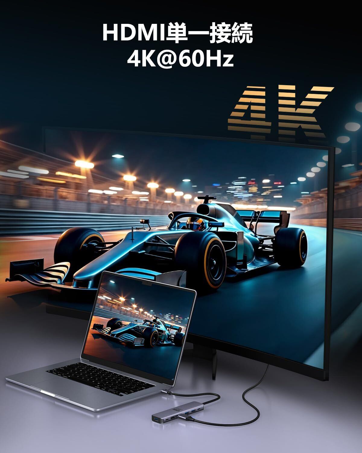 【高解像度映像出力】HDMI単独使用時には最大4K@60Hzの高解像度出力が可能で、鮮明で滑らかな映像を提供します。さらに2台のディスプレイを同時接続しても、最大4K@60Hzの高画質をサポートします。動画編集、ゲーム、プレゼンテーションなど、視覚的精度が求められる作業でも細部まで鮮明に表示可能です。本製品はHDMI分配器やUSB→HDMI変換アダプタとしても活用できます。