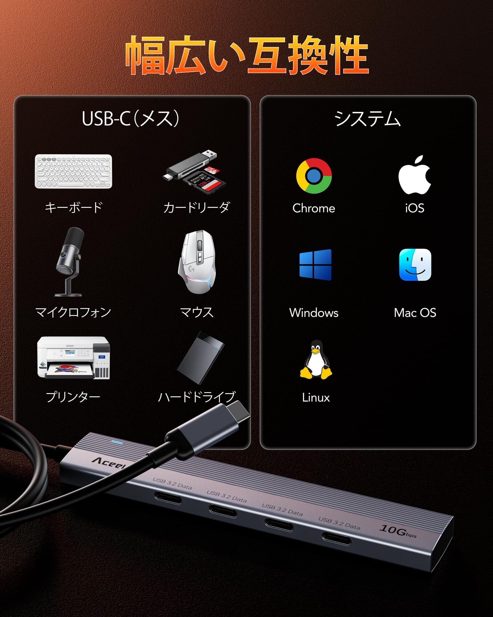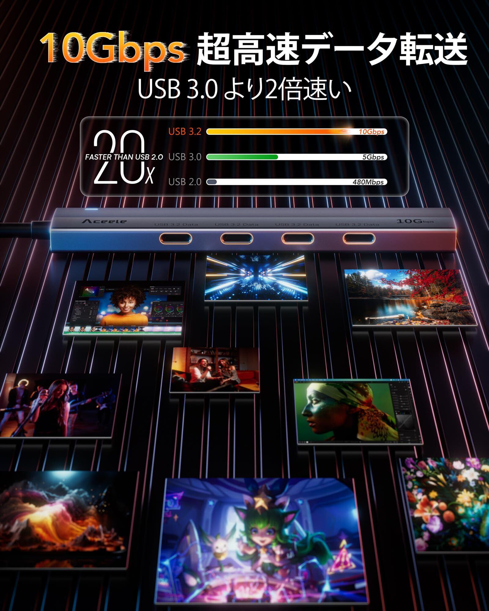 【2022最新】Aceele USB Cハブ10Gbps 4ポート拡張 USB 3.2 Gen 2 ハブ60cmケーブル付き 4xUSB-C ポートとType-c データポート付きUSB C to USB 3.2 変換アダプタ、MacBook Pro、iMac、iPad Pro、Chromebook、Samsung Galaxy 用 在宅勤務 ゲームに最適