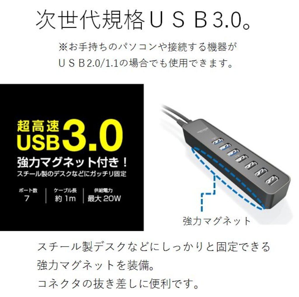 エレコム USB3.0 ハブ 7ポート ACアダプタ付(150cm) セルフ/バス両対応 マグネット付 MacBook / Surface Pro / Chromebook他 ノートPC Nintendo Switch対応 ブラック U3H-T706SBK