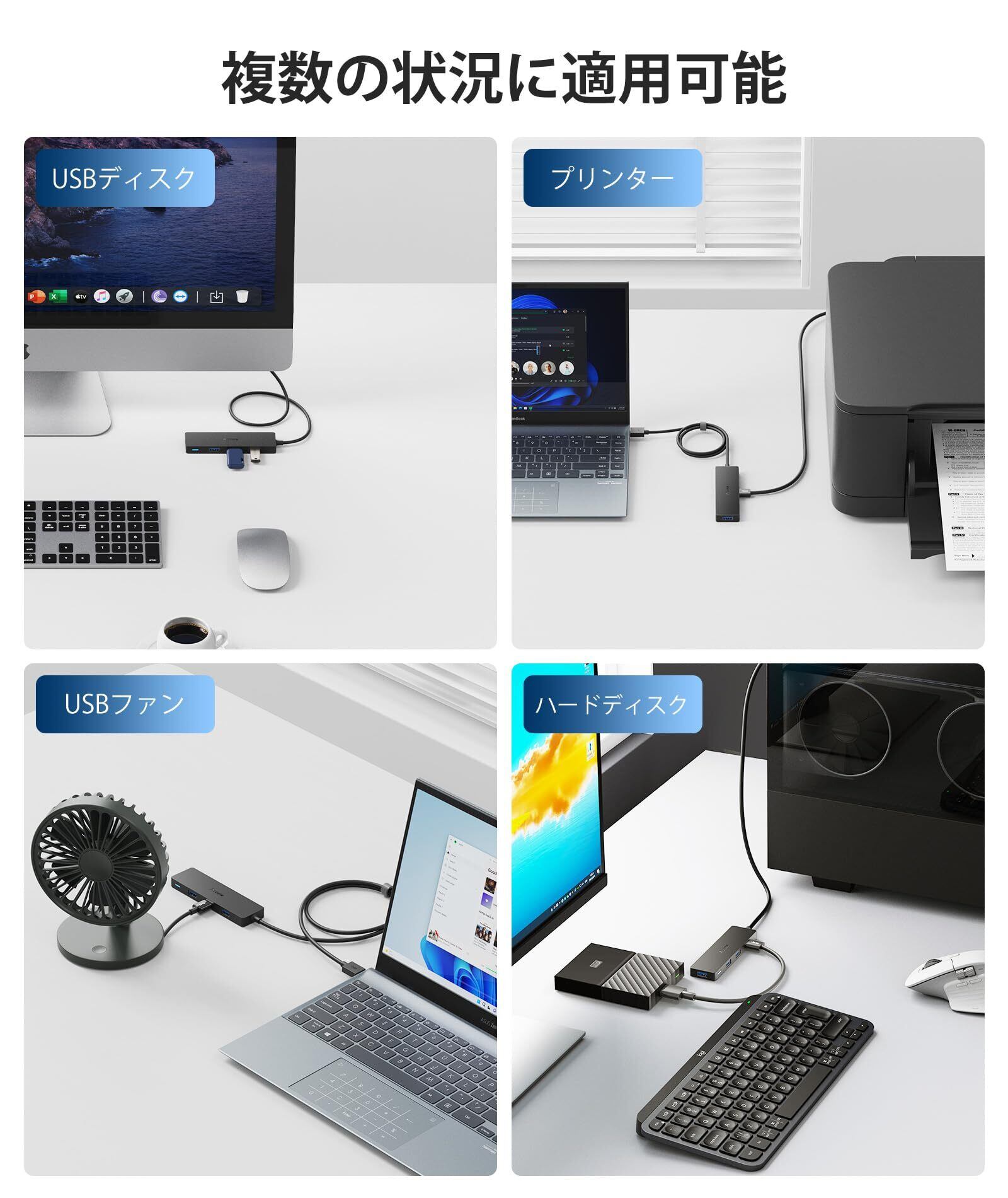 【超高速データ転送】ハブの四つのusb3.0ポートが最大5Gbpsのデータ転送速度に対応しており、HD動画や容量が大きいファイルを数秒で転送できます。また、ポートがusb2.0のデバイスにも対応できます。高速転送により、非効率な待ち時間を減らし、仕事の効率を向上させます。