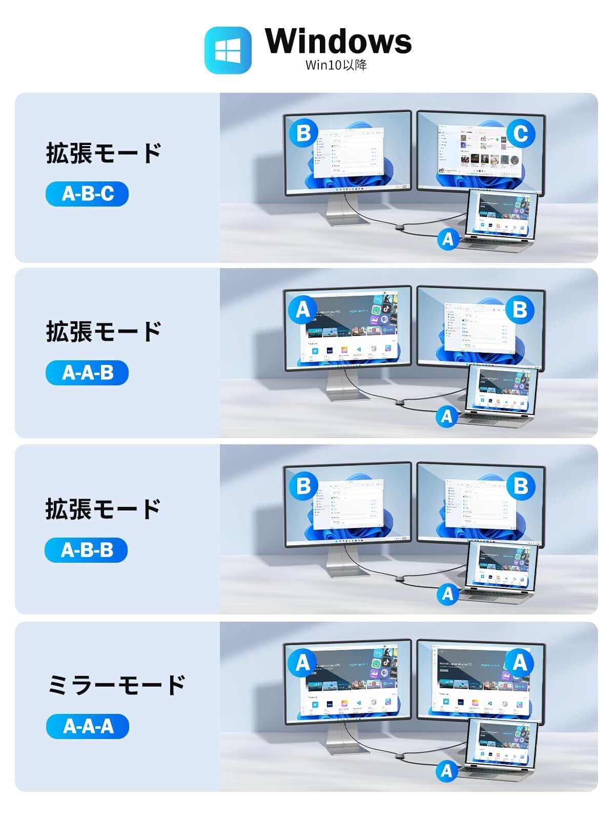 MacOSではミラーモード【AAA】と拡張モード【ABC】をサポートし、Mac OS 10.15以降のバージョンに対応しています。 Windowsではではミラーモード【AAA】に加え、拡張モード【AAB】【ABB】【ABC】の計4モードを利用可能で、Windows 11/10で動作します。 デュアル HDMI 外部2画面出力 の最大解像度は1920x1080@60Hzです。ご注意いただきたい点として、①「Udisplay」ドライバーのインストールが必要です。②ChromeOS、Android、iOS、Linux、Unixには非対応となりますので予めご了承ください。