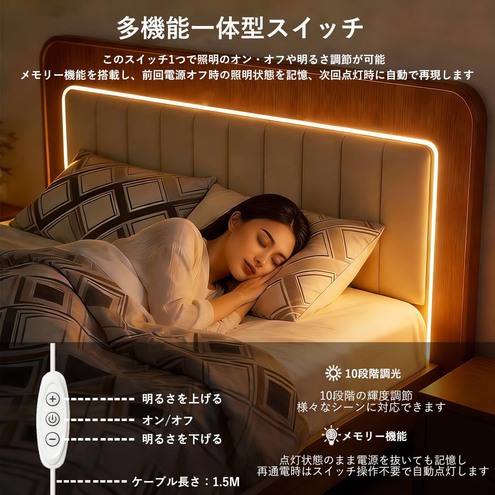 【メモリー機能・10段階調光可能】このテープライトはメモリー機能を搭載しており、電源を再接続すると前回電源を切った時の状態で点灯します。アレクサ対応コンセントなどのスマート電源と組み合わせれば、遠隔操作は可能です。また、10段階調光器付きで、使用シーンに合わせて明るさを調整できます。