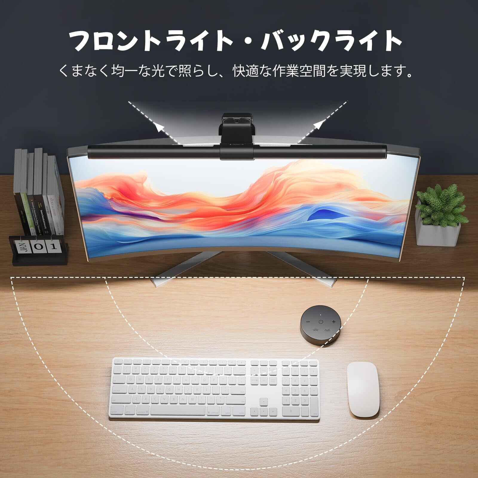 【広い照射範囲】モニターライトバーは光源が一直線に長いため、照射範囲が非常に広いのも特徴です。机の上の隅々まで明るく照らすことができます。また、光が均一でムラがないため、長時間のデスクワークや読書も、ストレスなく快適に進みます。