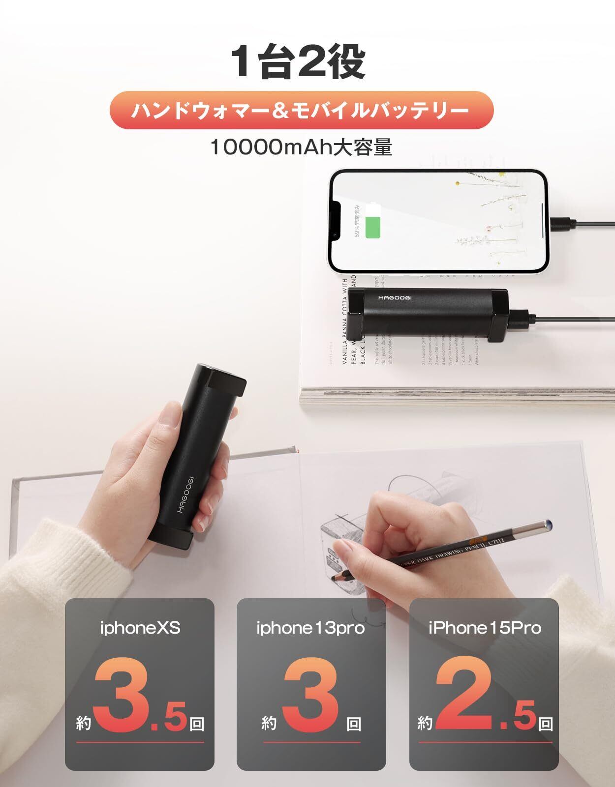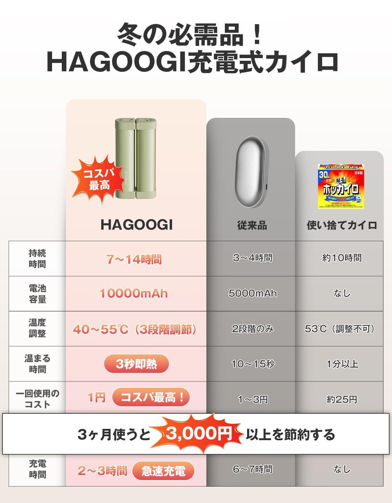 【新着商品】HAGOOGI (ハゴオギ) 充電式カイロ 電気カイロ クリスマス プレゼント 急速発熱 3階段温度調節 モバイルバッテリー 10000mAh大容量 ハンドウォーマー 14時間連続発熱可能 急速充電 エコ 小型 超軽量 分離式設計 持ち運びやすい 寒さ対策 アウトドア 通勤通学 贈り物 (ブラック)