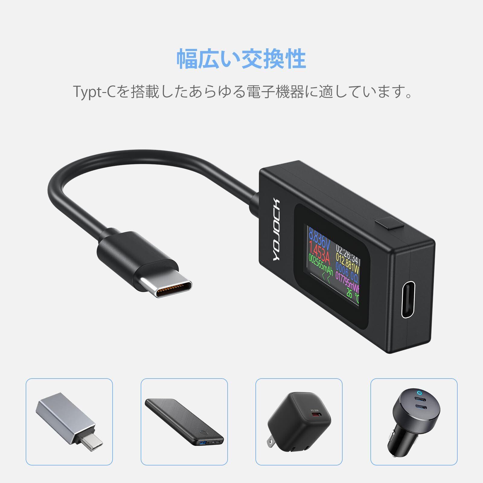 YOJOCK USB電流 電圧チェッカー 電流双方向対応Type-C USBテスター 多機能カラー大画面表示(ケーブル付きモデル)4-30V 0-6.5A