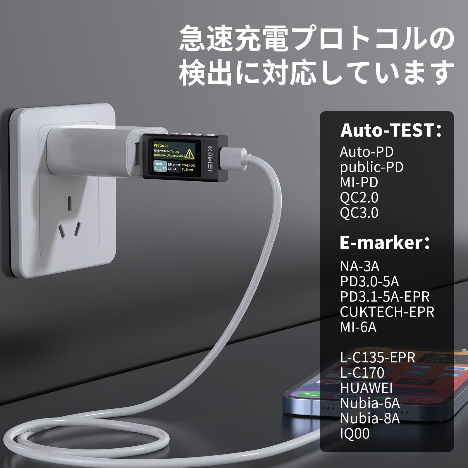 急速充電プロトコル検出対応:本USBC電流テスターは急速充電プロトコルの検出に対応しています。新しく購入した急速充電器のプロトコルを確認したい場合は、本テスターに直接接続するだけで検出可能です。放電機器を接続する必要がなく、デバイスの損傷を防ぐことができます。2種類の検出モードを搭載しており、急速充電プロトコルの確認がより簡単かつ便利に行えます