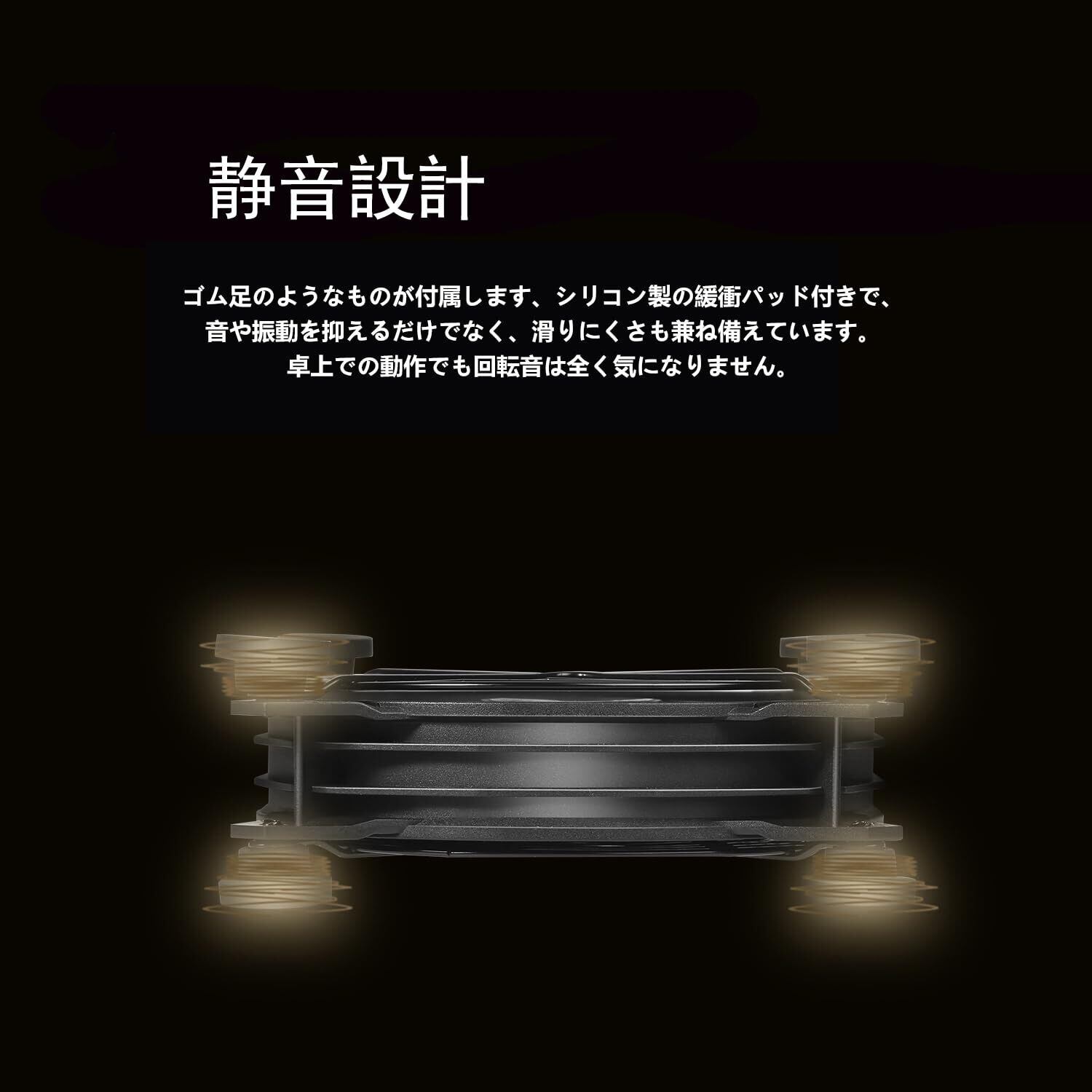 【極めて静】超静音設計で、動作中の騒音は最大18dbです。usb小型ファンには大きなゴム足搭載、二つ送風ファンでは合計16個の防振ゴム足が両面ファンガードに固定されており、シリコン製の緩衝パッド付きで、音や振動を抑えるだけでなく、滑りにくさも兼ね備えています。自習室、図書館などの静かな場所に使っても、気になりません。