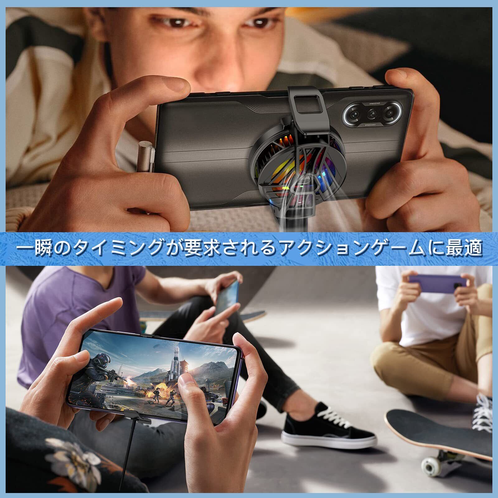 【3秒で急速冷却】専用半導体を使用していることで、効果的な吸熱・排熱を行い、わずか3秒でスマホがクールダウンを始め、ゲームや配信中は10℃~15℃まで冷却できます。空気力学に基づいて循環ファンが設計されるように1つのファンが搭載されて、より一層冷却効果を高めます。一瞬のタイミングが要求されるアクションゲームなどでは、スマホクーラーを導入すれば、画面のかくつき・操作反応の鈍さなどを防げます。YouTubeなどでゲーム配信をしている方にとしても良い冷却対策です。