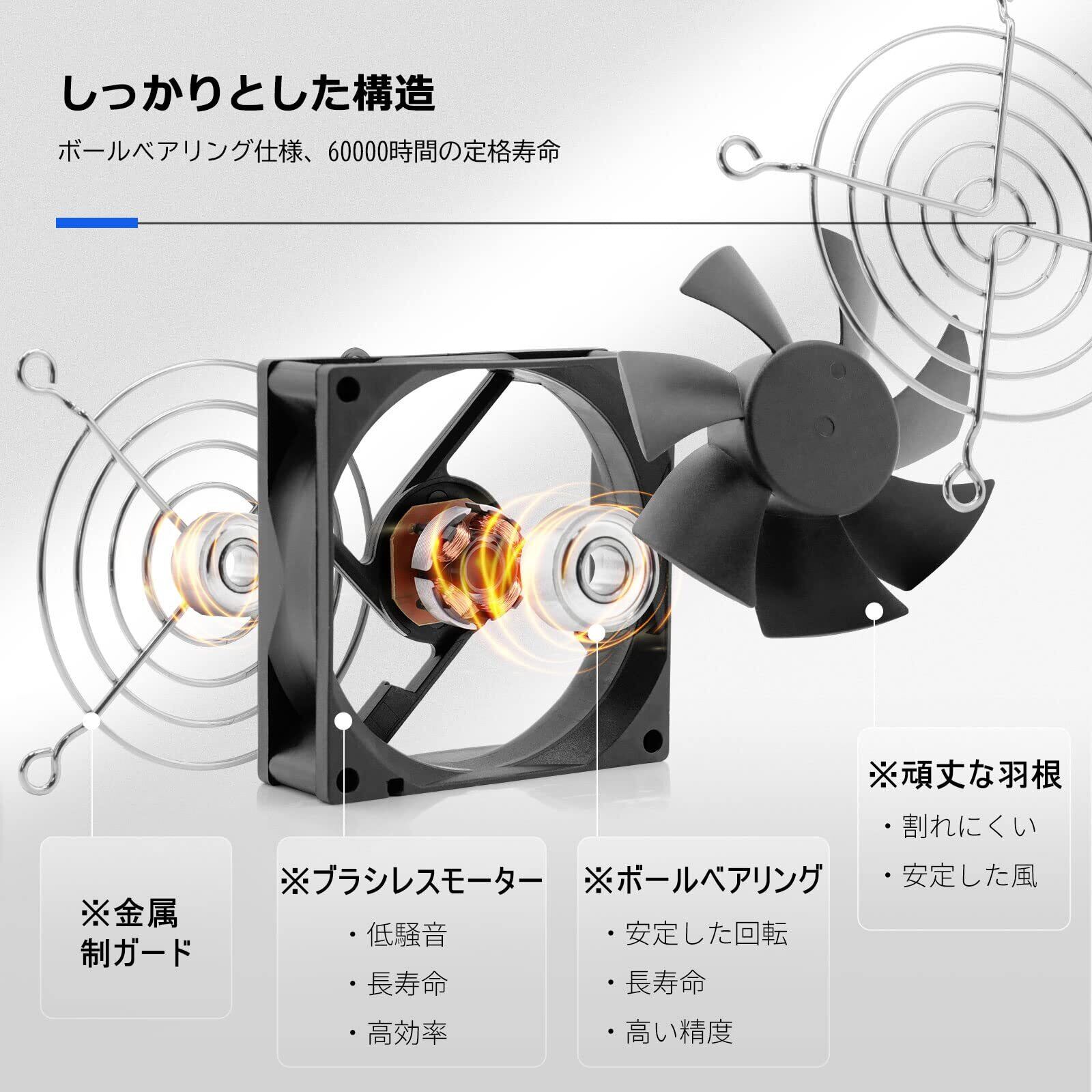 デュアルボールベアリングを採用しており、約60000時間の理論寿命があります。また、稼働するにつれて、騒音の増加にならず、24時間連続稼働可能。