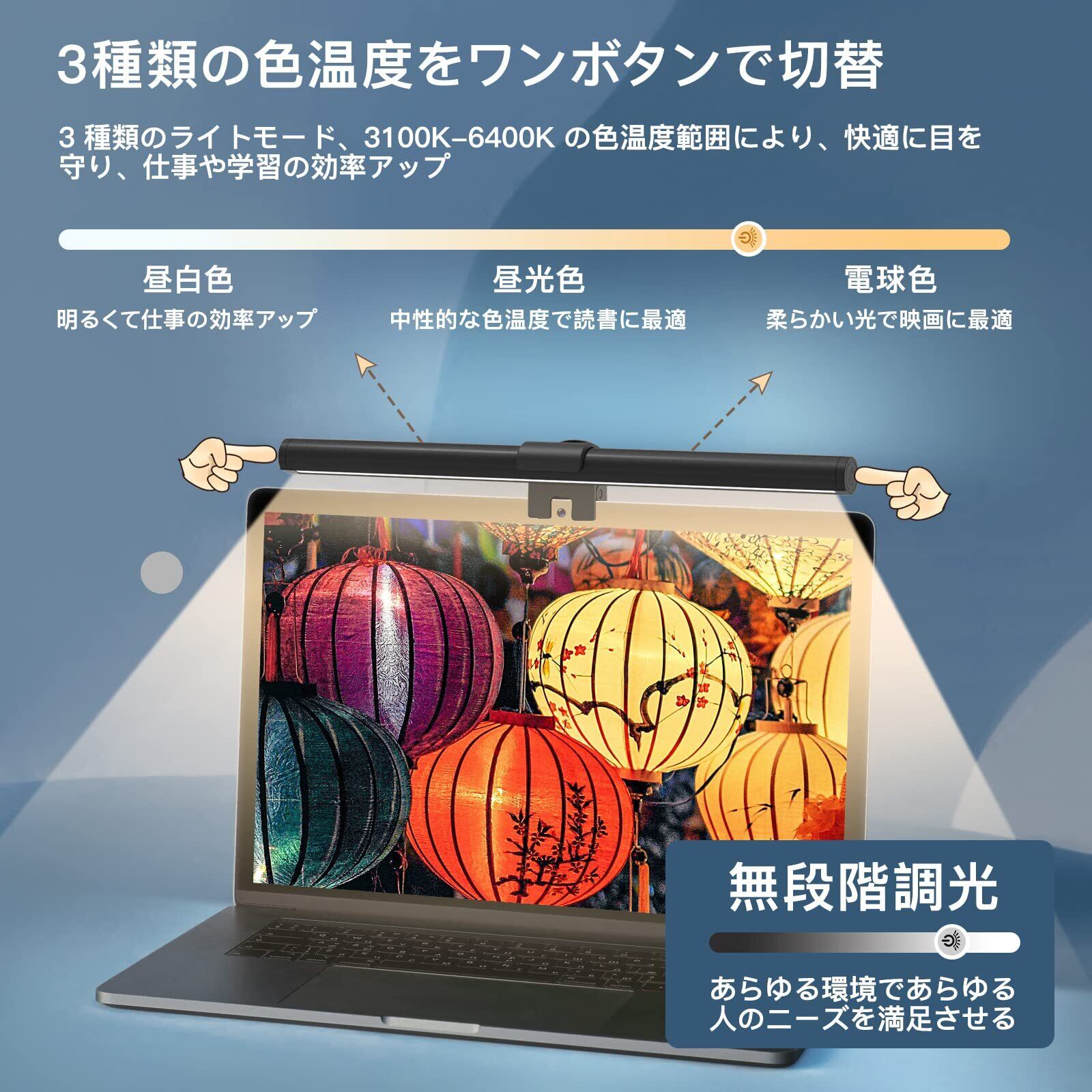 【無段階調光・3段階調色】明るさと色温度の調節センサーをモニターライトの両サイドに配置、タッチコントロールを採用しているためスマートな操作を実現できます。明るさは、10%-100%無段階調光できます。色温度は、3100Kから6400Kまで電球色・昼白色・昼光色に切り替えられます。昼間の作業で集中力を上げたい時は昼白色や昼光色に、夜間やリラックスしたい時は電球色に、どんなシーンにも最適な明るさと光の色を実現します。
