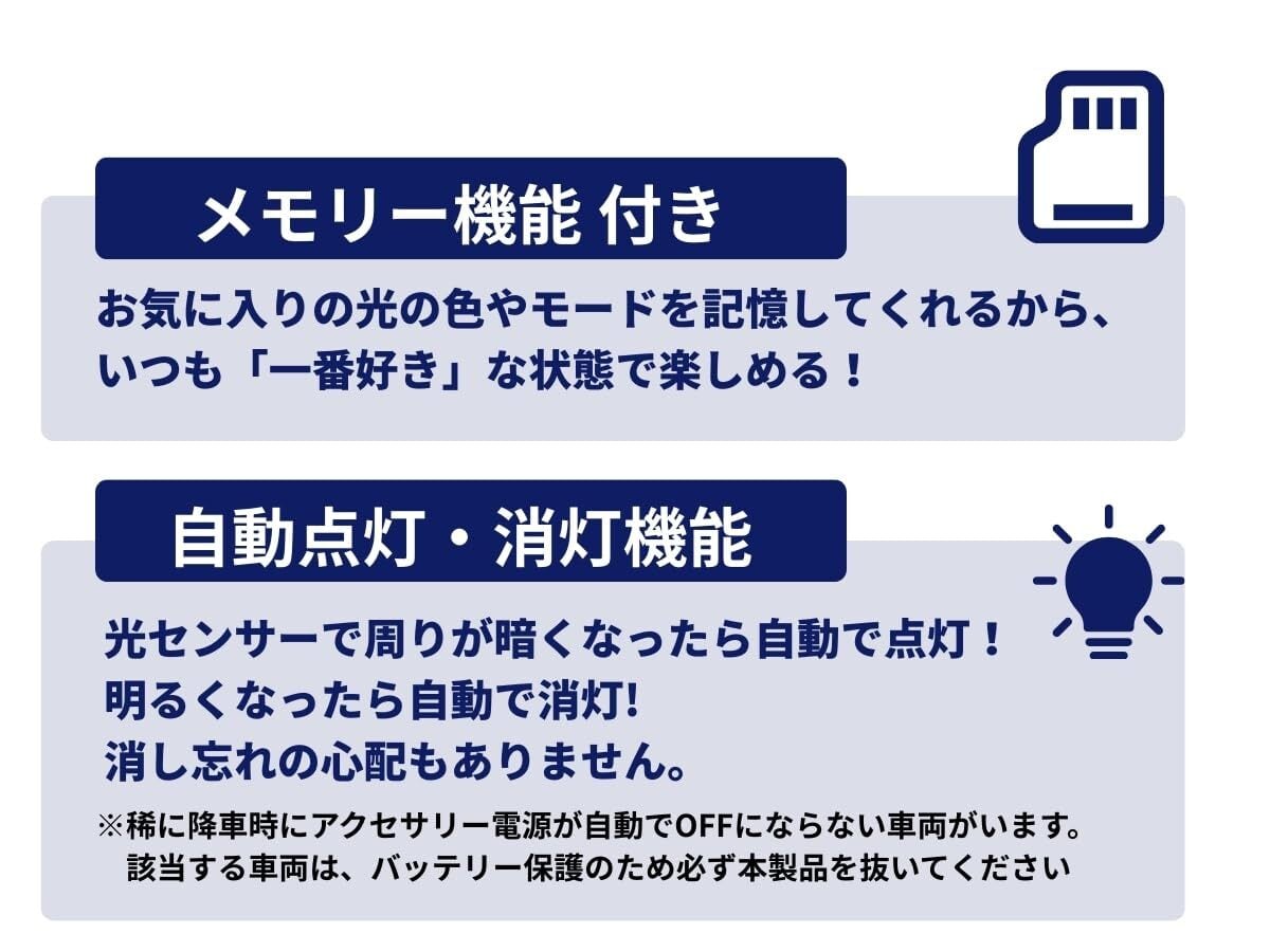【エフシーエルこだわり機能】1. メモリー機能:お気に入りの光の色や点灯モードを記憶するので、毎回の調整手間は必要ありません。 2. 自動点灯・消灯機能:光センサーで周りが暗くなったら自動で点灯!明るくなったら自動で消灯!消し忘れの心配は不要です。※まれに降車時にアクセサリー電源が自動でOFFにならない車両がいます。該当する車両は、バッテリー保護のため必ず本製品を抜いてください。 3. 自由自在な照射アングル:スイング機能×点灯面の選択によって、狙ったところに確実に光があたります。