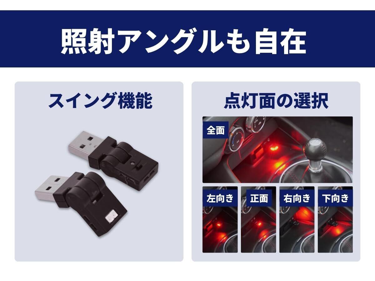 【必要な場所へ、ダイレクトに光を】スイングタイプだからこそ実現できる、自由自在なライティングで、あなたのカーライフをもっと快適に、もっと自分らしく彩ります。車内を彩るアクセントに最適な『単調モード』、車内空間を一気に気分転換可能な『8色グラデーションモード』、優しい揺らめきで安らぐ空間に『ほたるモード』の好みやシーンに合わせて点灯モードを選択できます。明るさ調整も可能! 点灯色:レッド(赤)、オレンジ、イエロー(黄色)、グリーン(緑)、スカイブルー(水色)、ブルー(青色)、パープル(紫)、ホワイト(白色)