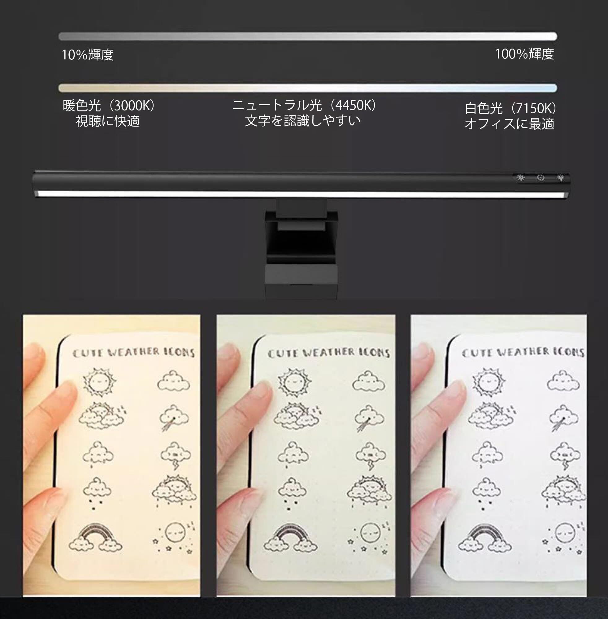 ✿LEDのモニターライトはデスクの上に置かないモニターに掛けるタイプなので机のスペースを広く確保できます。 部屋の照明を使用せず、デスク上の明かりが欲しい時に最適で、節電にも一役かいます。